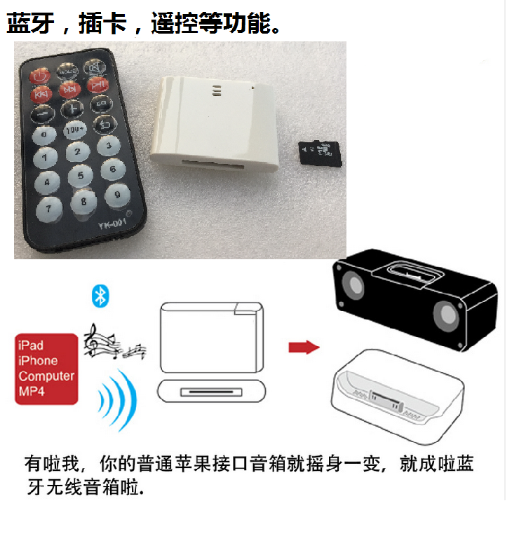 5.0蓝牙接收器 30pin苹果4s接口音箱蓝牙模块JBL苹果座读卡带遥控