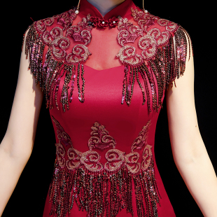 鱼尾年会旗袍模特走秀团队舞台演出服女 晚礼服修身 紫缘萱中式 长款