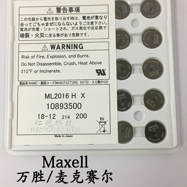 LIR2016 3V可充电纽扣电池代替ML2020 全新正品 Maxell万胜ML2016
