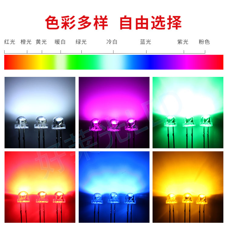 直插LED灯珠 白光红蓝绿黄 LED发光二极管F5 5mm草帽短脚有边透明