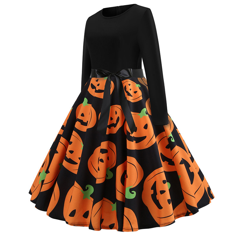 欧洲站圣节印花拼接长袖 夏季 女装 大码 大摆连衣裙送丝带Dress 新款