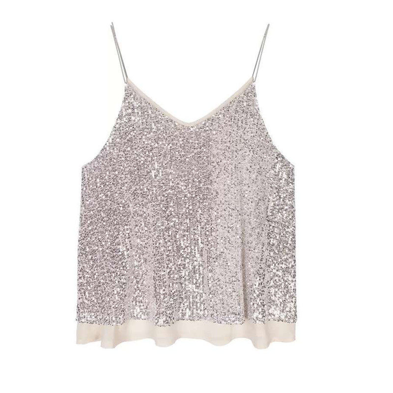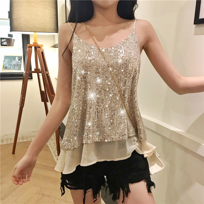 上衣 无袖 大码 V领亮片吊带背心女夏胖m外穿宽松遮肚内搭性感打底衫