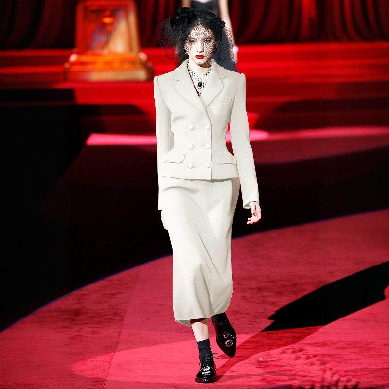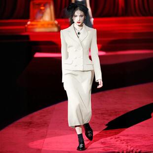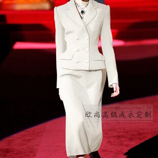 气质大牌西服 裙修身 高端定制2024秋冬100%羊毛白色双排扣西装 套装