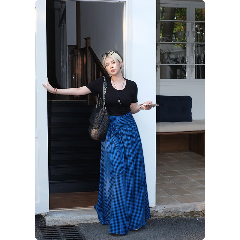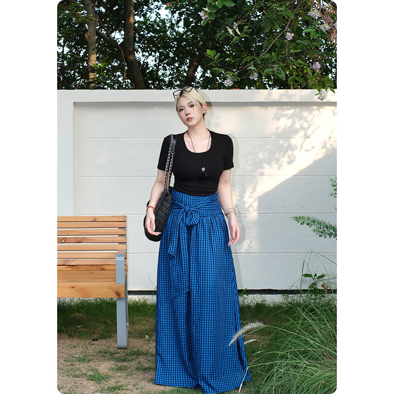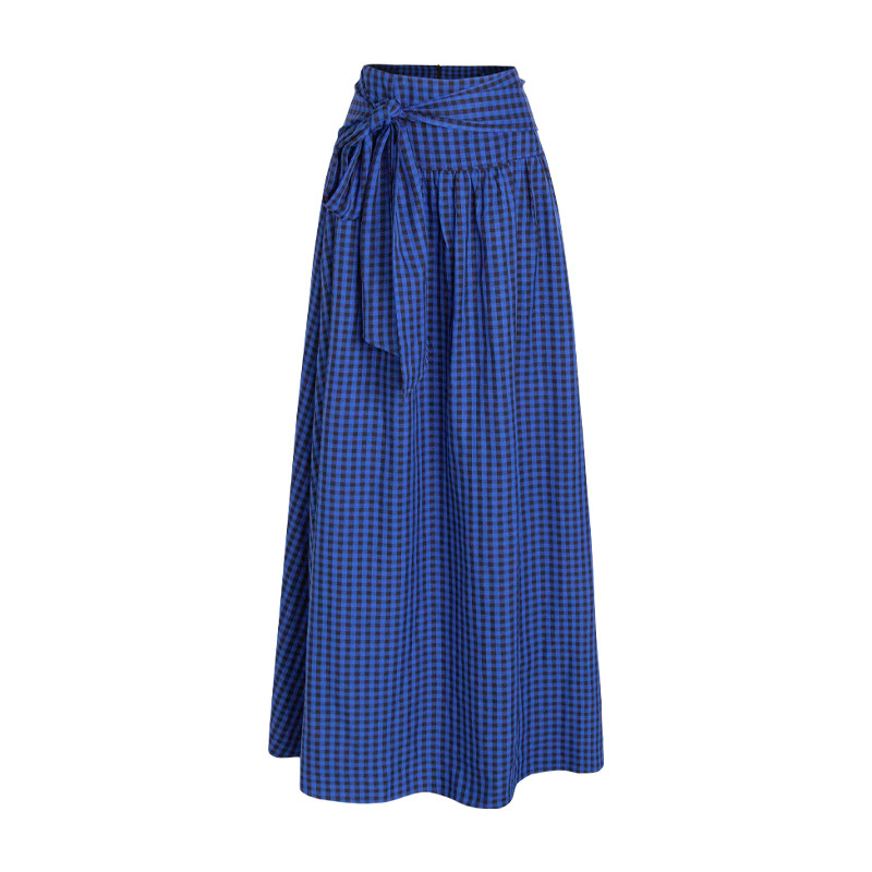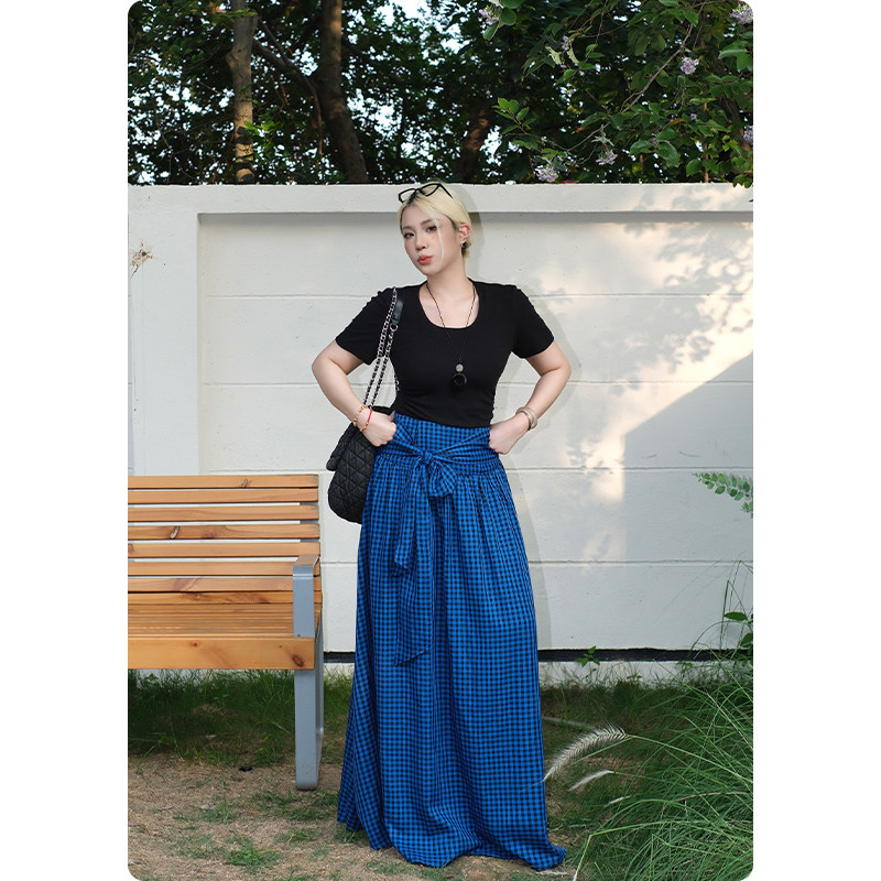 女装 复古格子半身裙女夏大码 宽松显瘦绑带a字裙 蓝影定格 糯米子