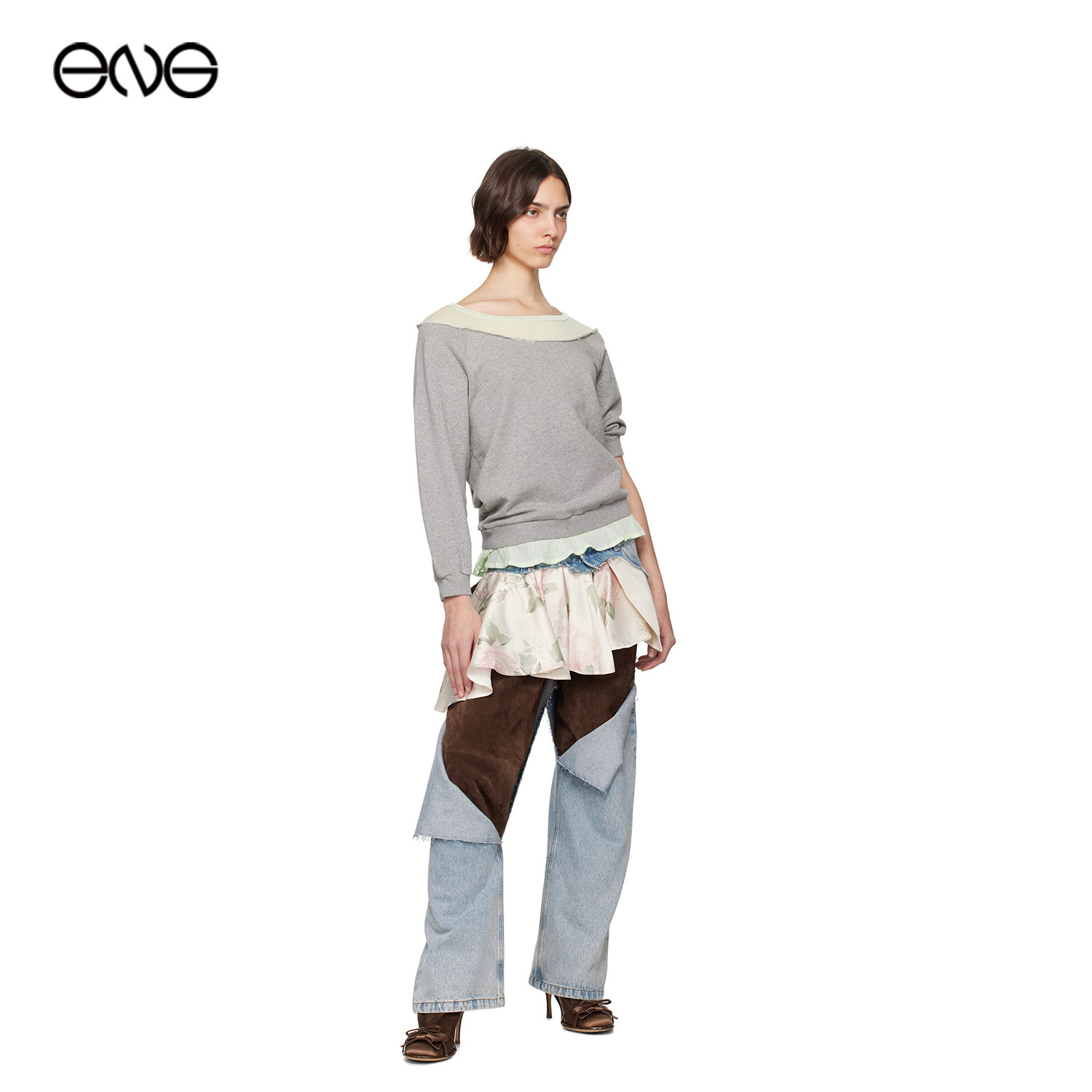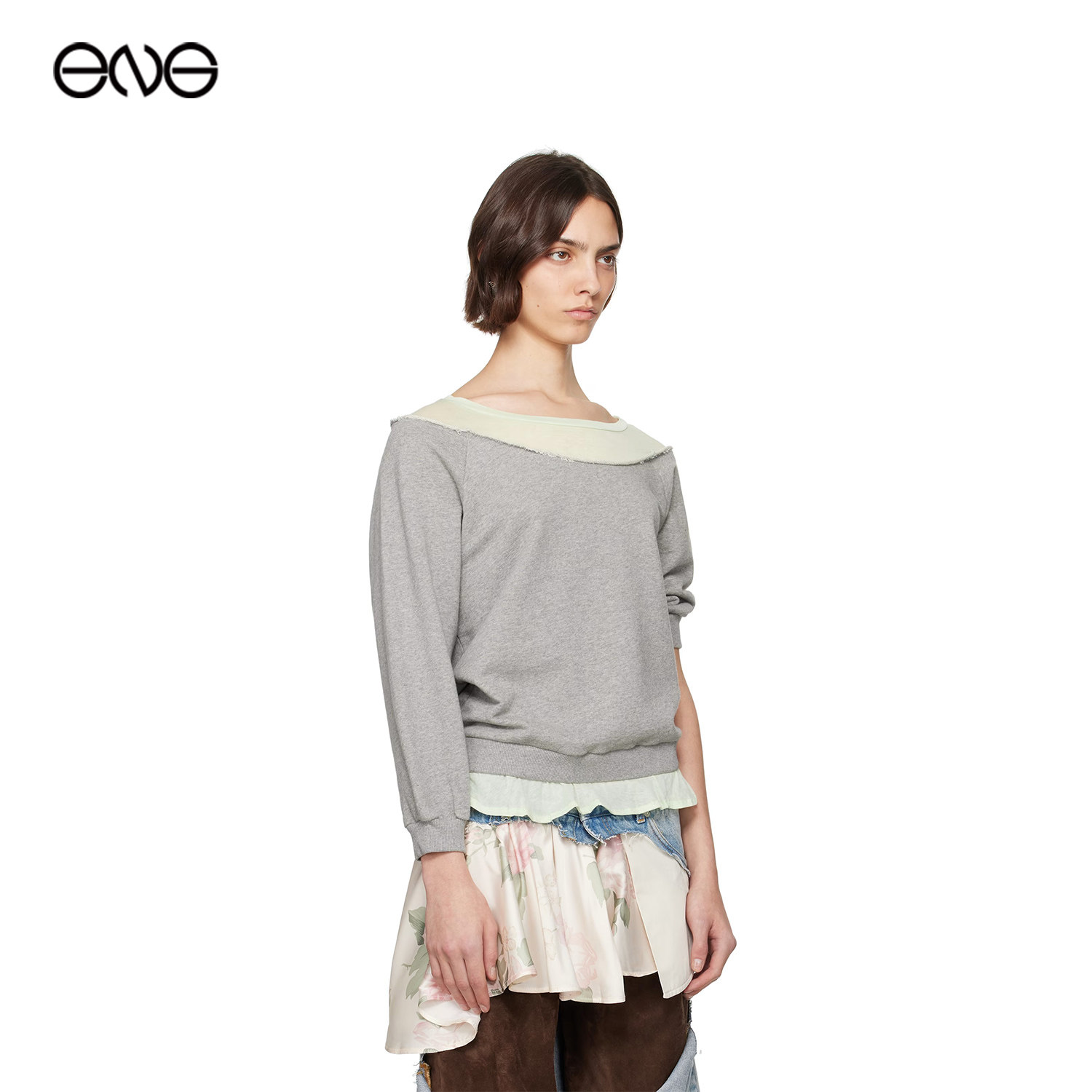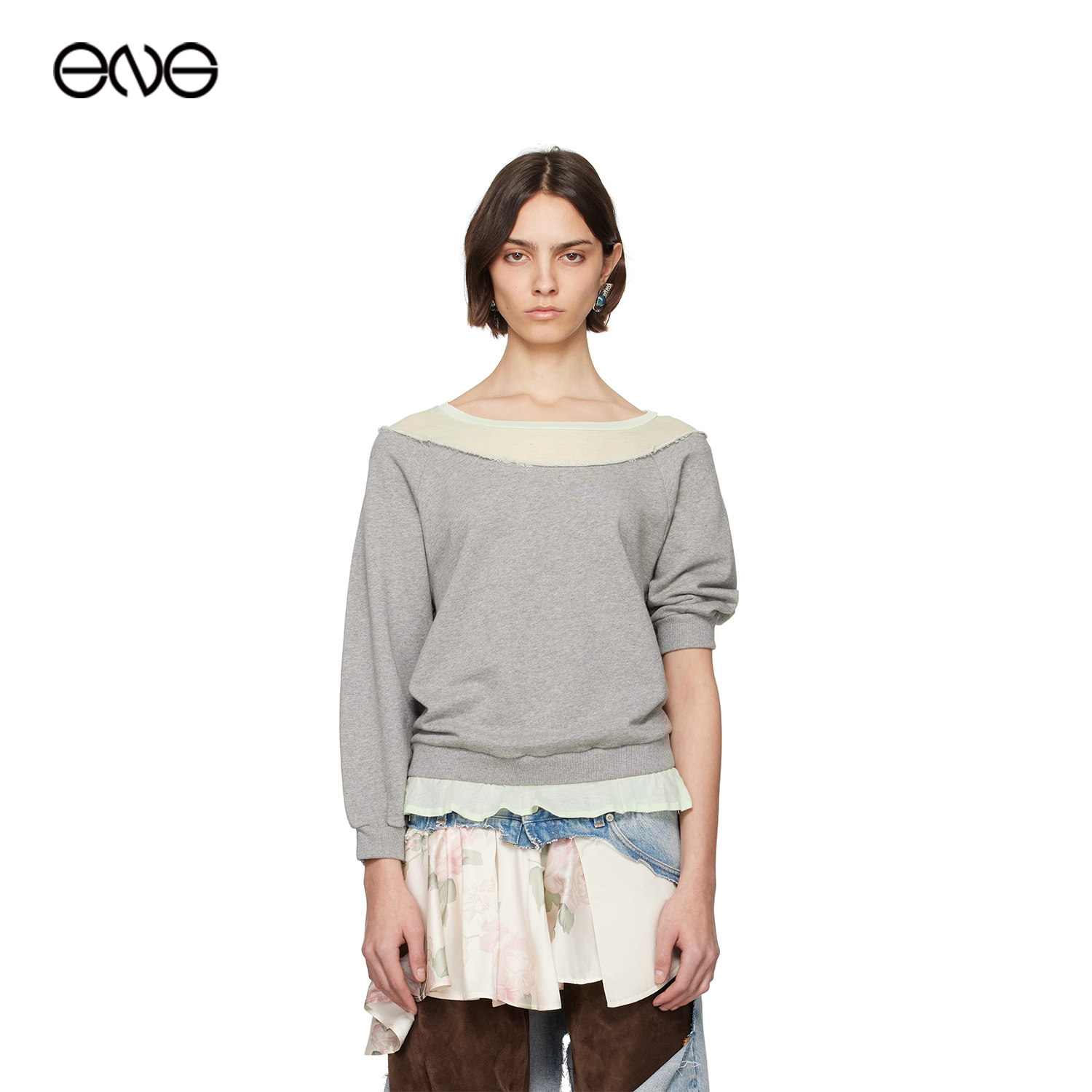 露肩拼接面料设计感短袖 ALL T恤女装 ENG