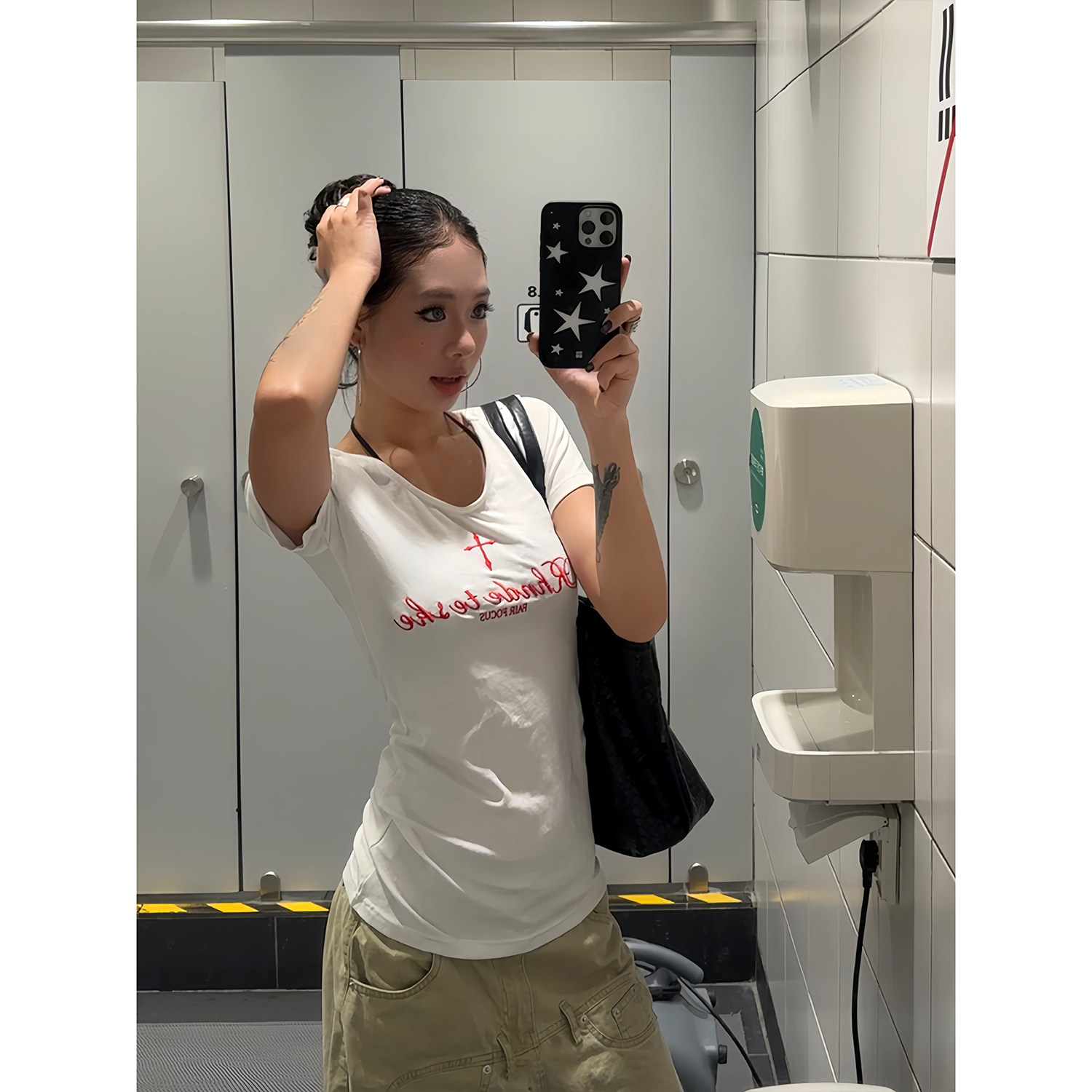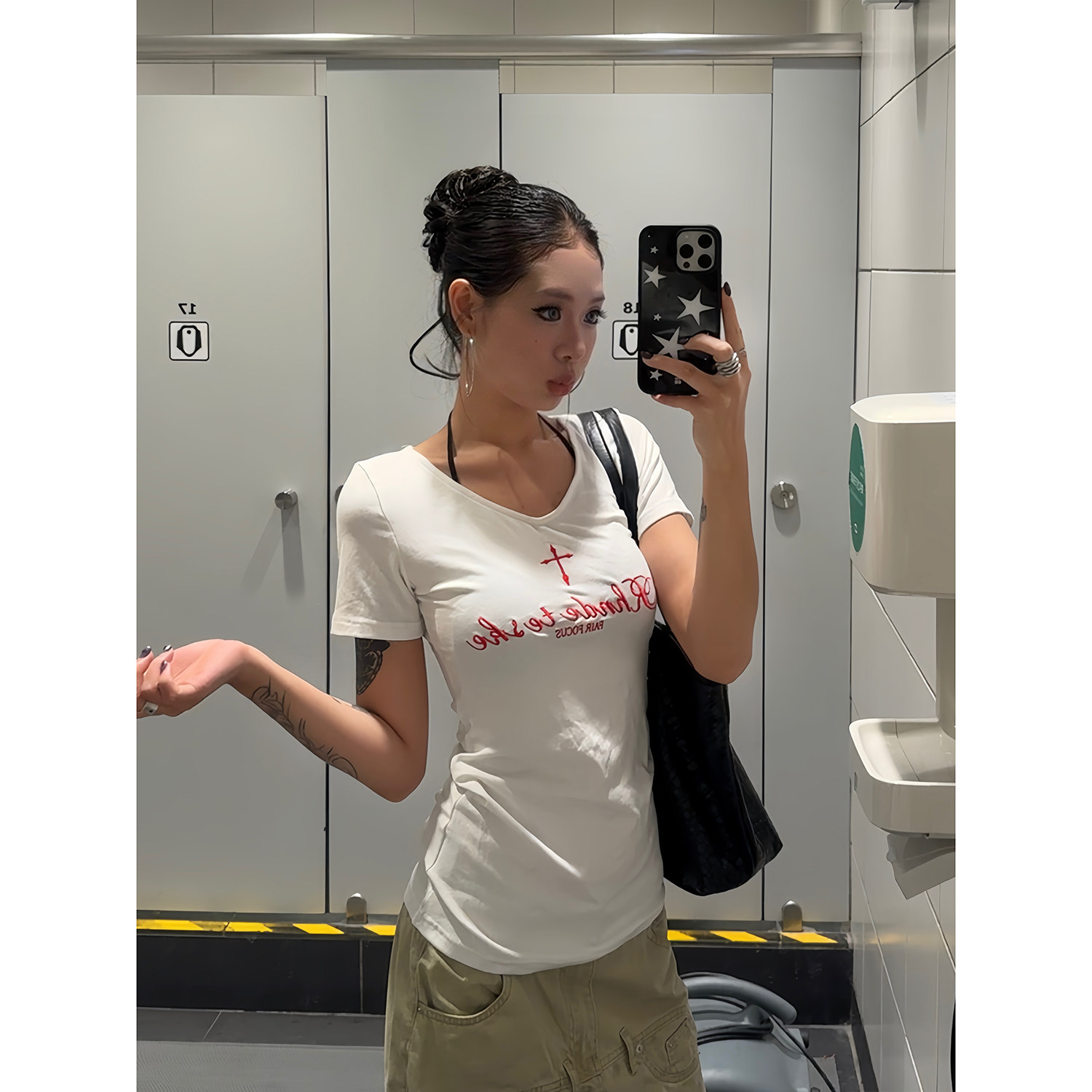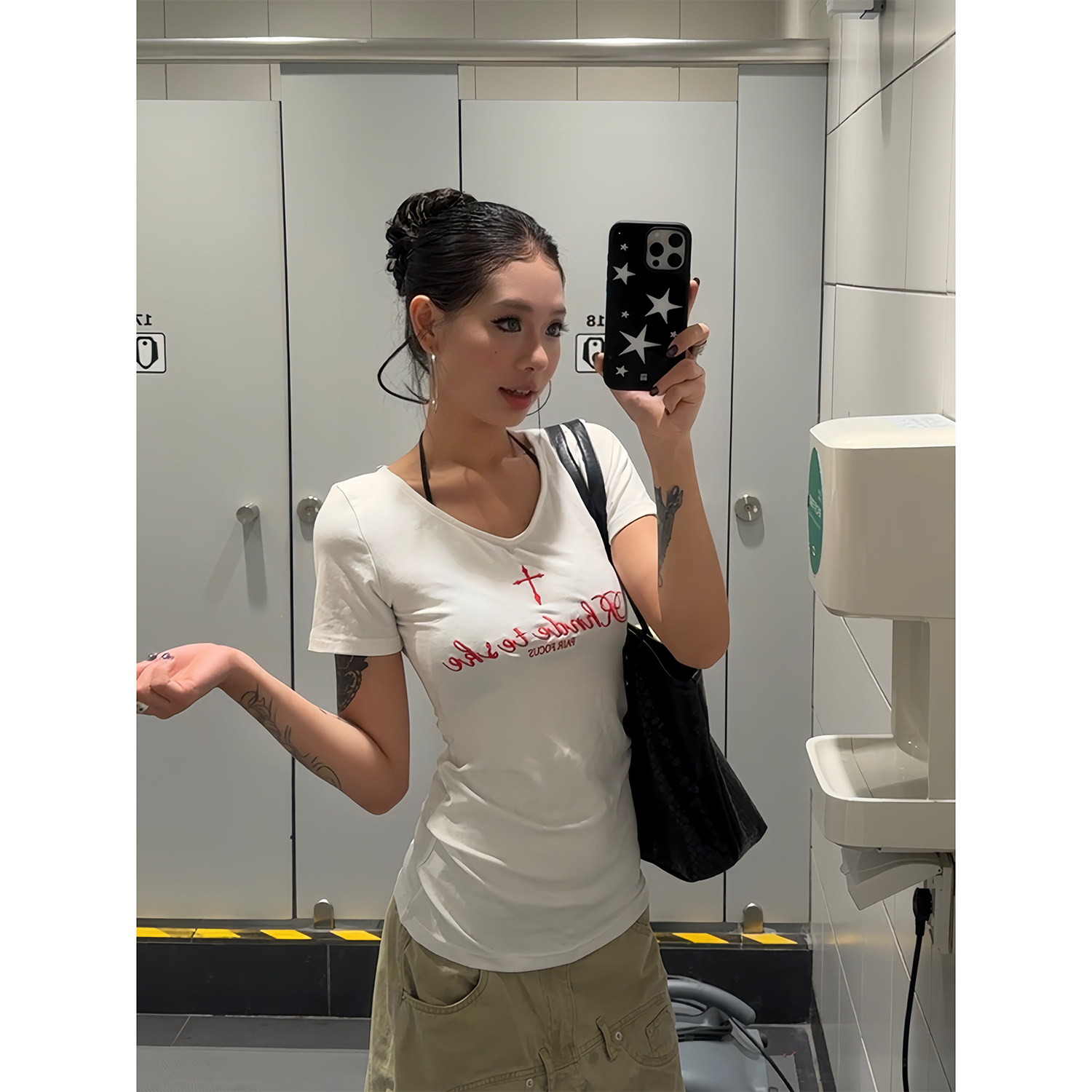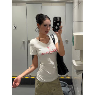 白色V领设计十字刺绣夏季 F383 T恤显瘦修身 复古短袖 女 2025美式