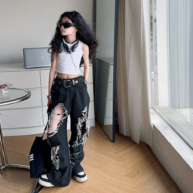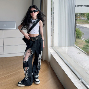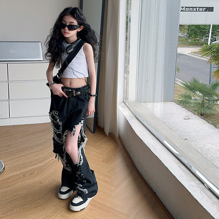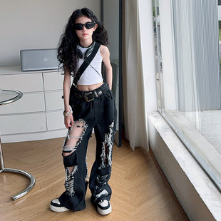 夏季 女大童阔腿裤 2025新款 子辣妹装 儿童炸街街舞裤 童破洞牛仔裤