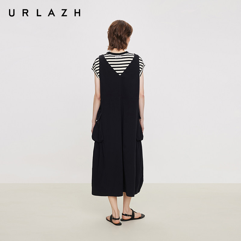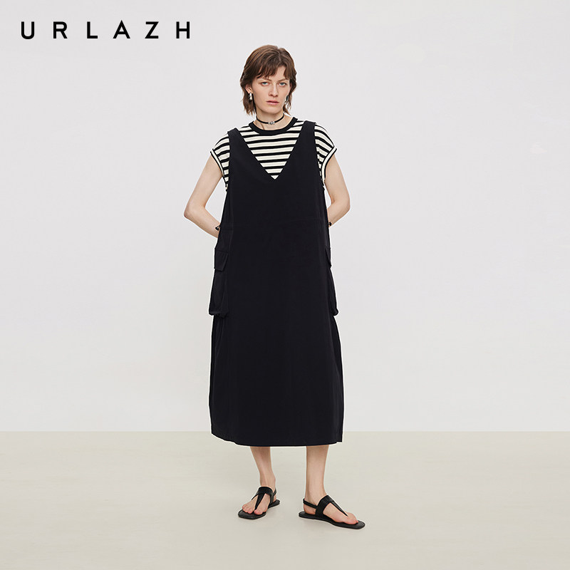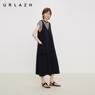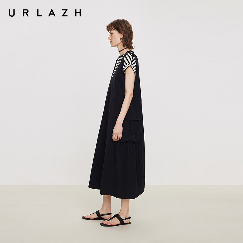 URLAZH有兰夏季 简约黑V领可调节抽绳A字背带裙女 新款