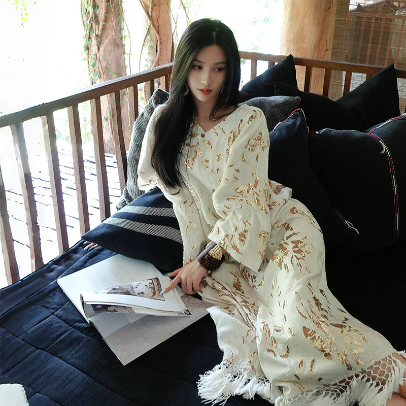 澄渔高定「栖鎏听风」新中式 原胚真丝亚麻烫金刺绣亮片流苏连衣裙