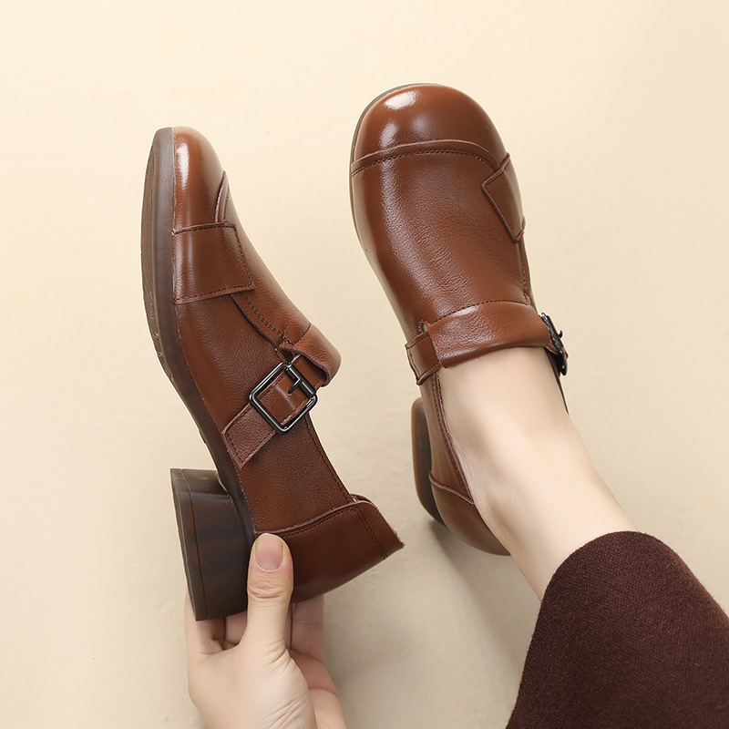 粗跟妈妈鞋 乐福鞋 春秋大码 牛筋软底舒适宽胖脚单鞋 女2025真皮新款