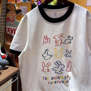 卡通趣味布朗小兔子 vintage 拼色纯棉重磅男女情侣T恤 复古 美式