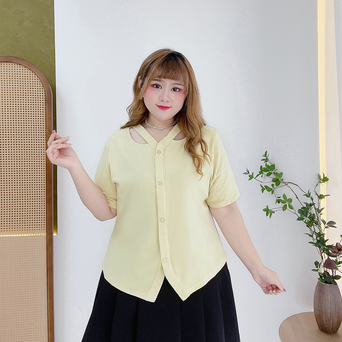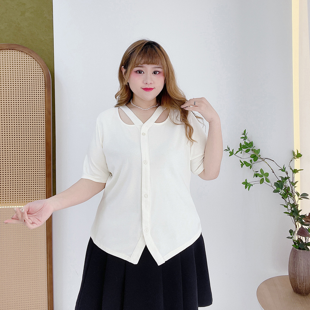 胖mm夏季 女装 200斤v领百搭正肩T恤 小心机镂空胖仙女莹莹大码 时尚