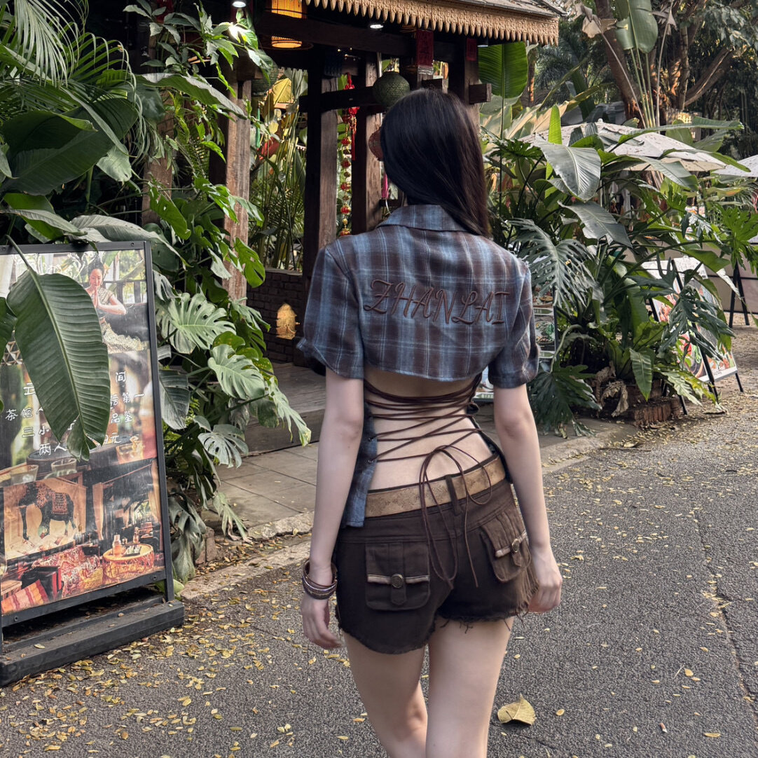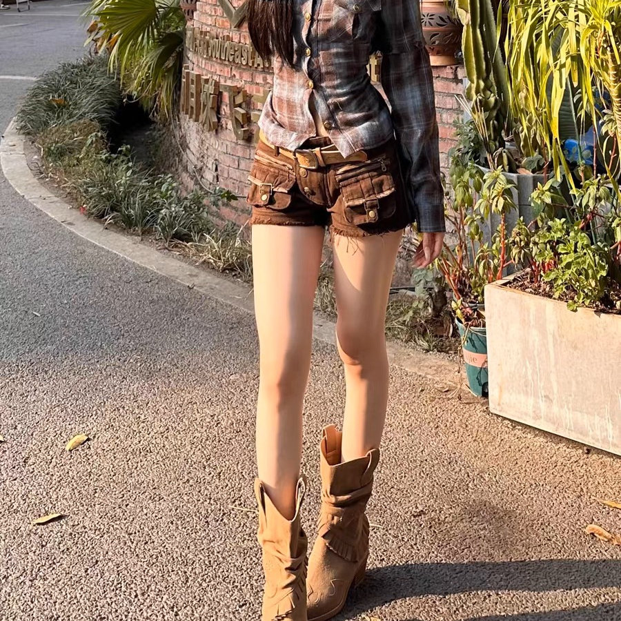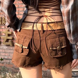 包臀热裤 美式 修身 女2025春夏新款 复古多口袋重工毛边低腰牛仔短裤