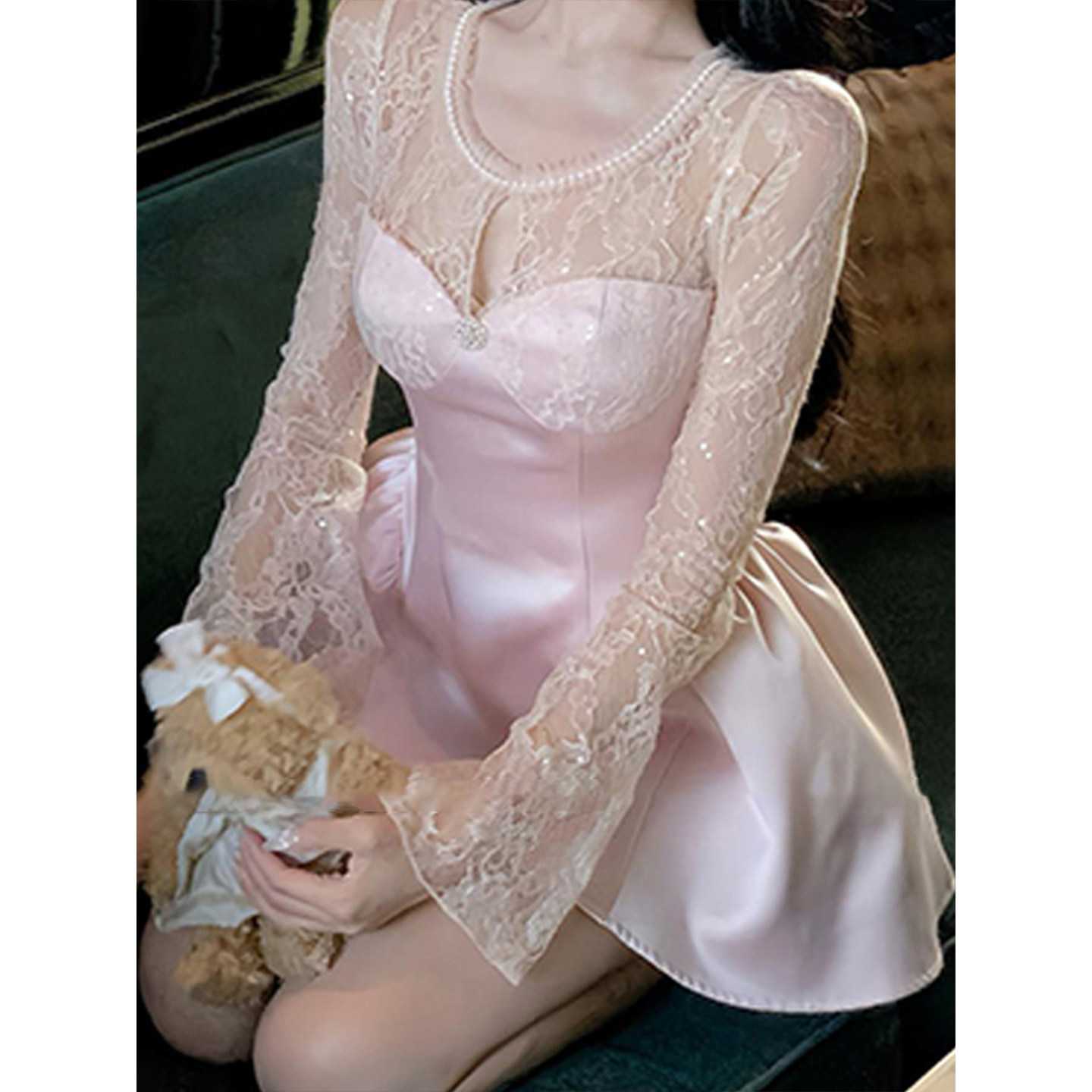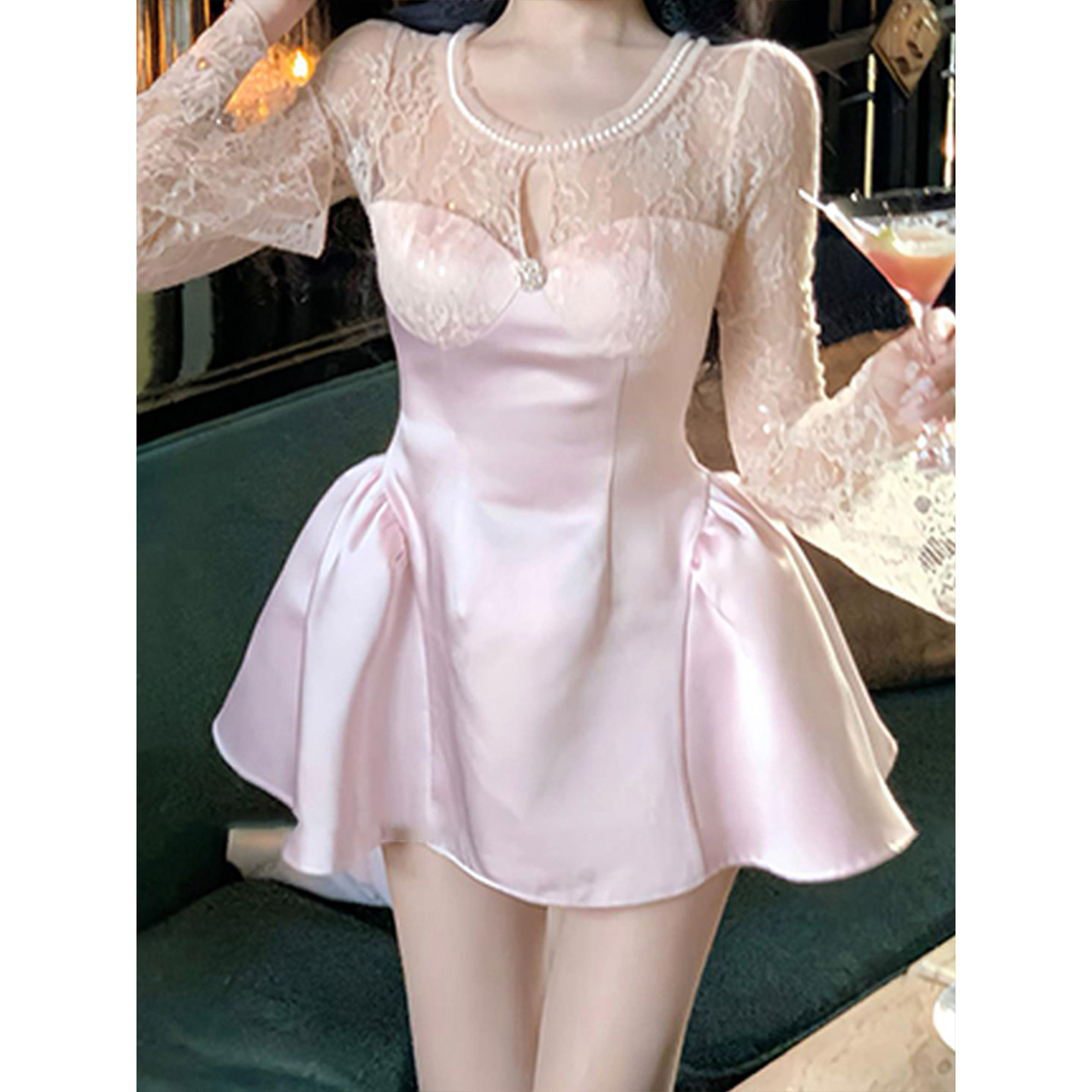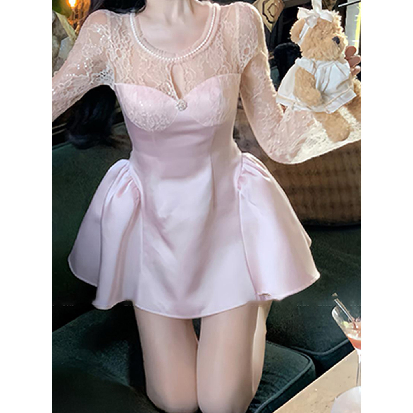 XZY 微胖mm纯欲蕾丝拼接缎面连衣裙女25年春收腰蓬蓬短裙 欣争艳