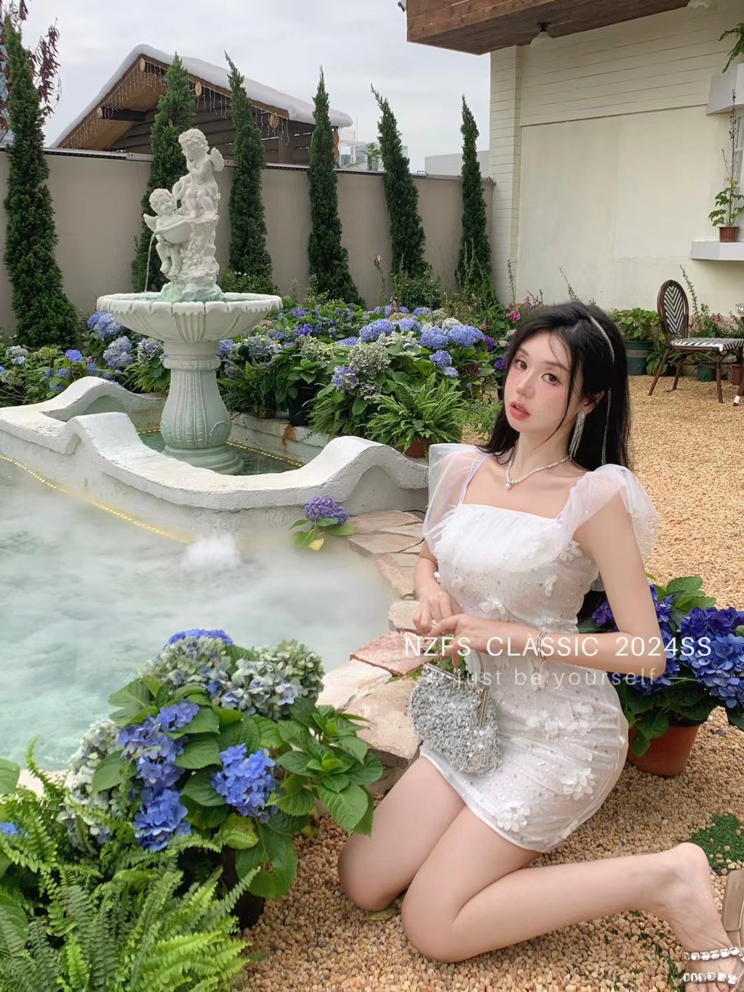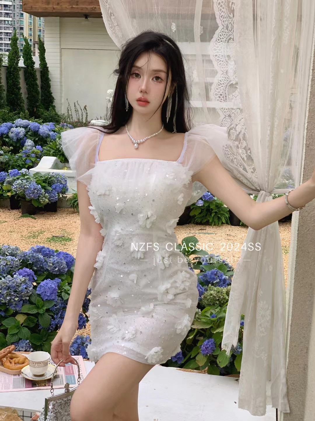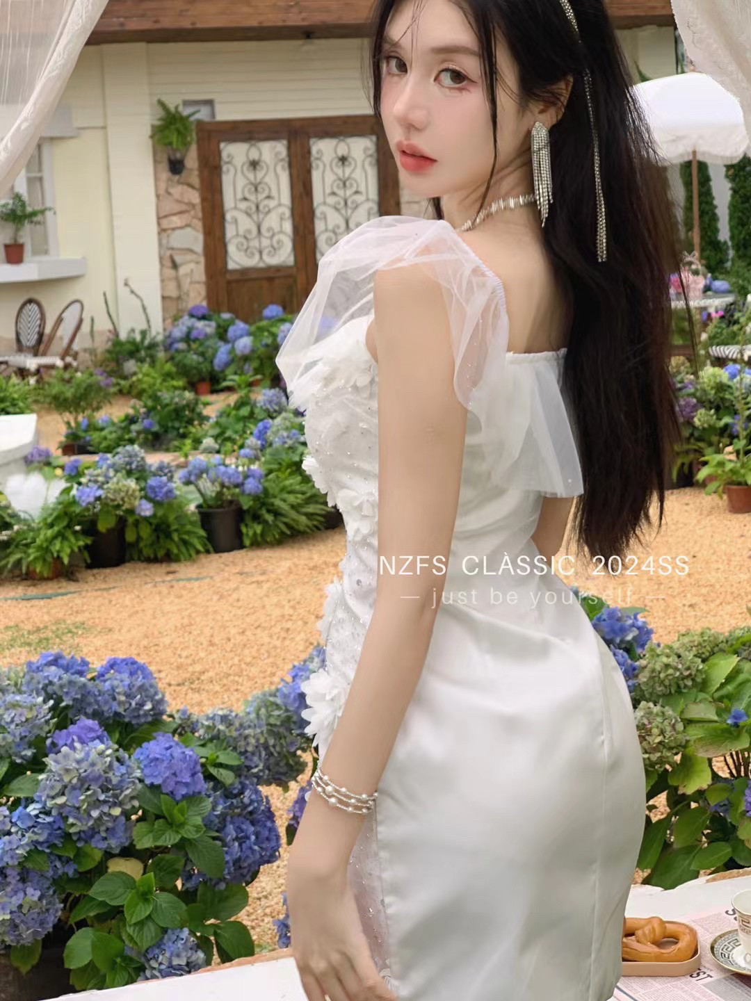 原创设计法式 气质清冷白色系网纱拼接重工串珠立体花朵抹胸裙女款