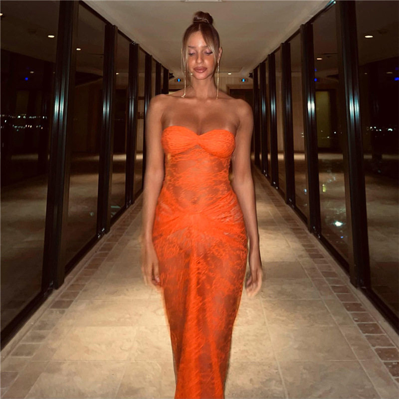 Ahagaga 性感蕾丝单层透视包臀连衣裙欧美辣妹一字肩抹胸露背长裙