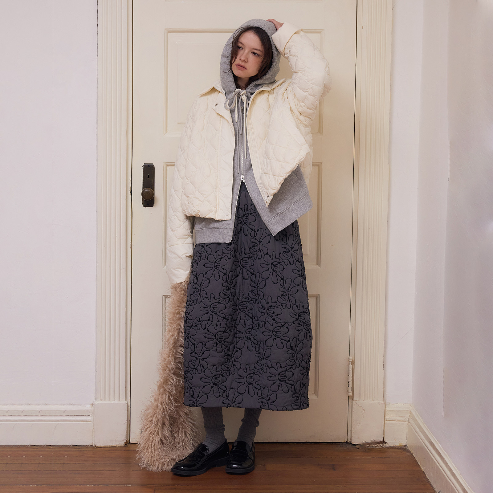 落落狷介冬季 丝绒半身裙黑波点印花加绒短裙蕾丝拼接2025秋冬新款