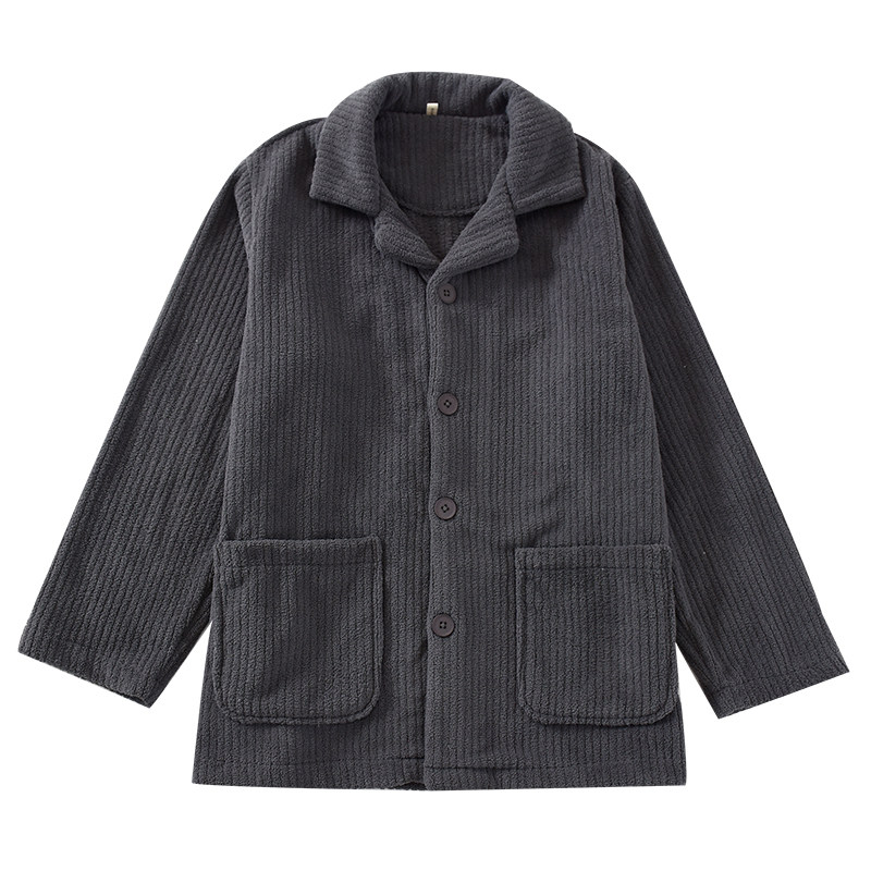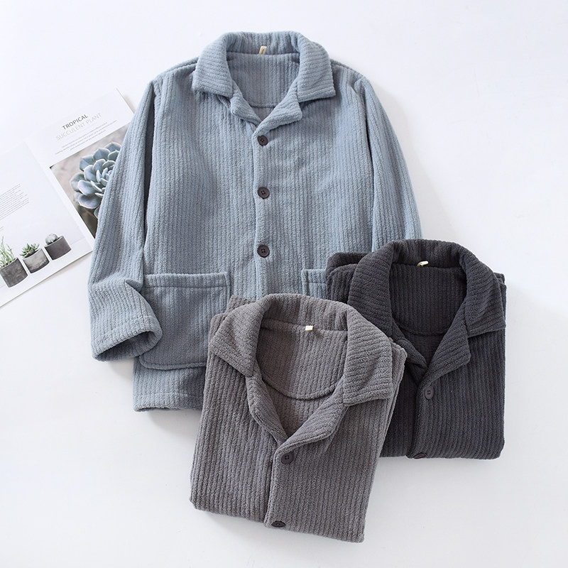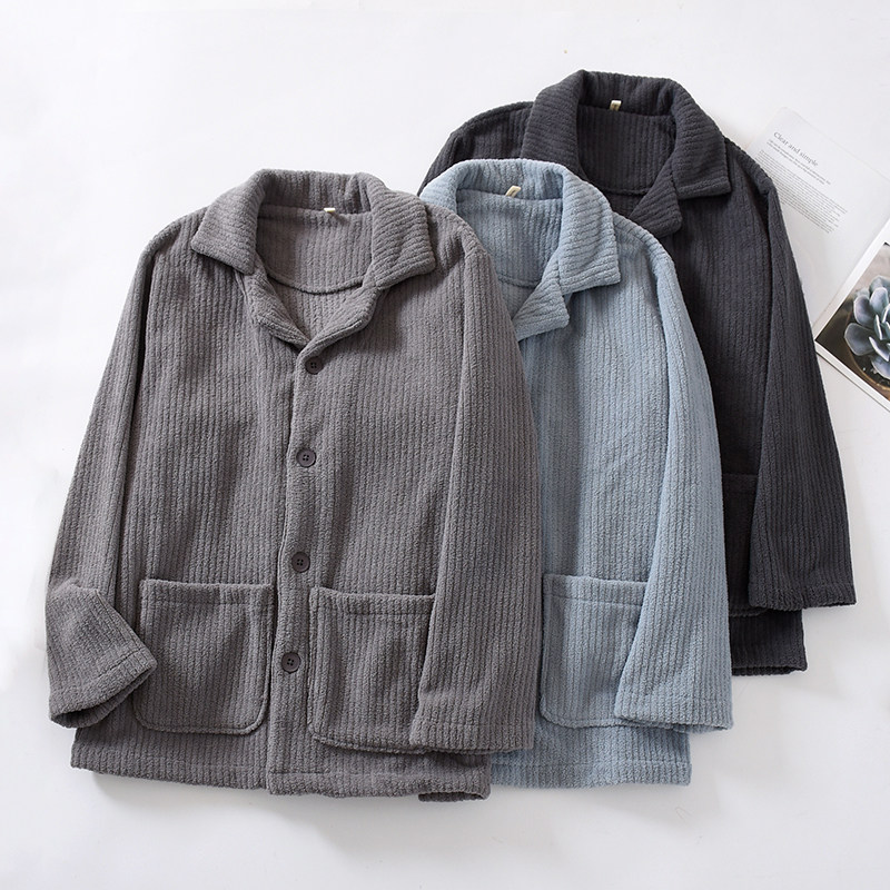 2024年冬法兰绒睡衣上衣男单件加厚保暖坑条珊瑚绒休闲居家可外穿