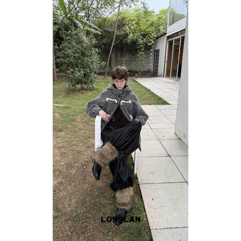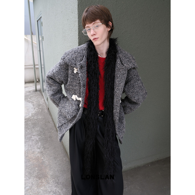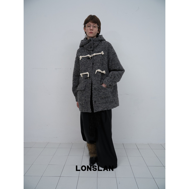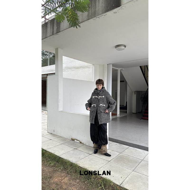 LONSLAN 小众设计高级感花灰呢子连帽牛角扣夹棉外套 2024秋冬新款