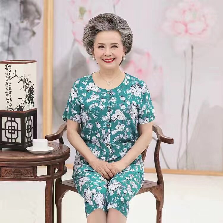 睡衣女可外穿老年人夏款 婆婆薄款 两件套纯棉绸妈妈开衫 七分裤 短袖
