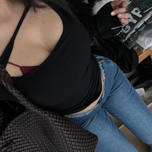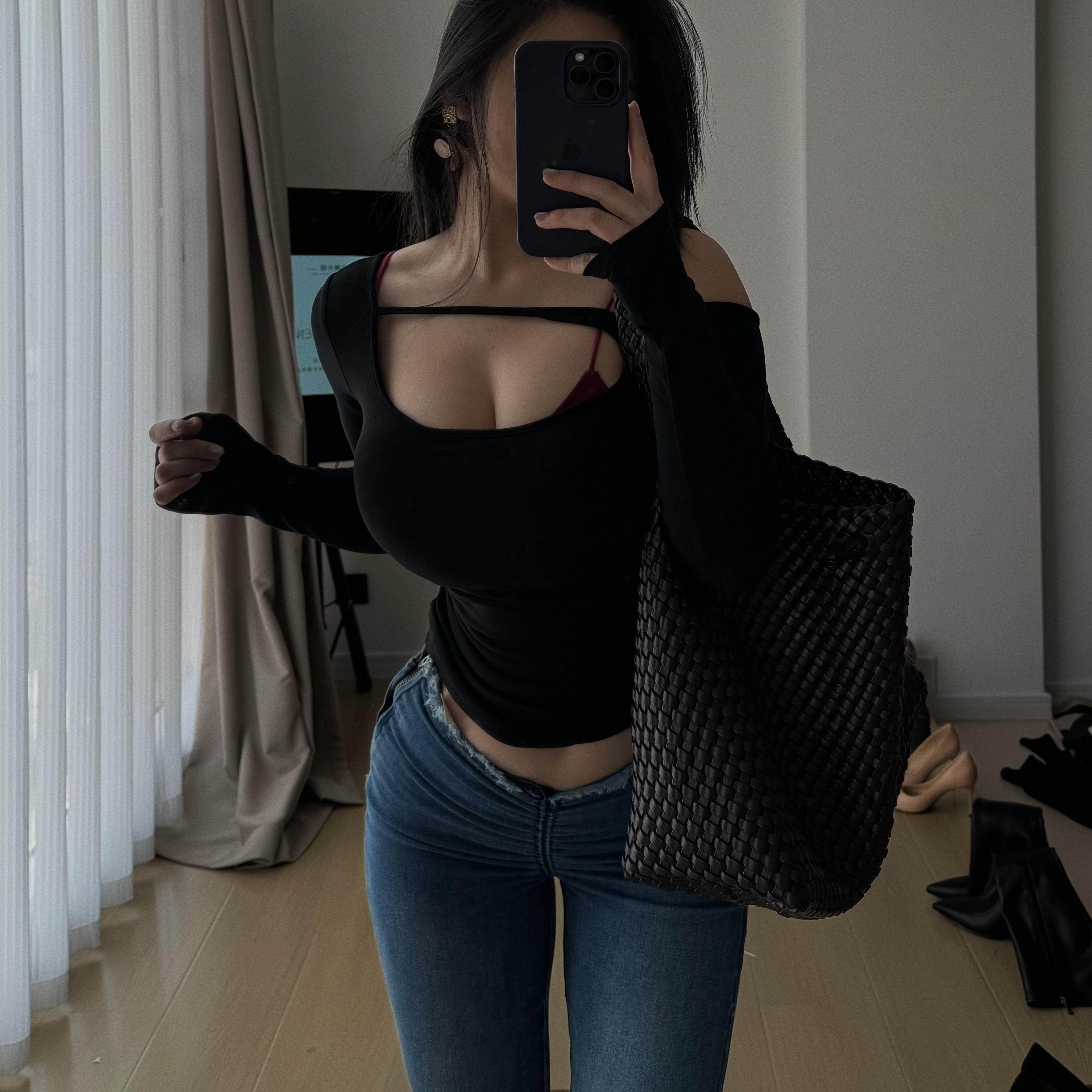 弹力小心思t 斜边设计黑色系设计胸垫长袖 蜜糖啵啵