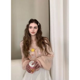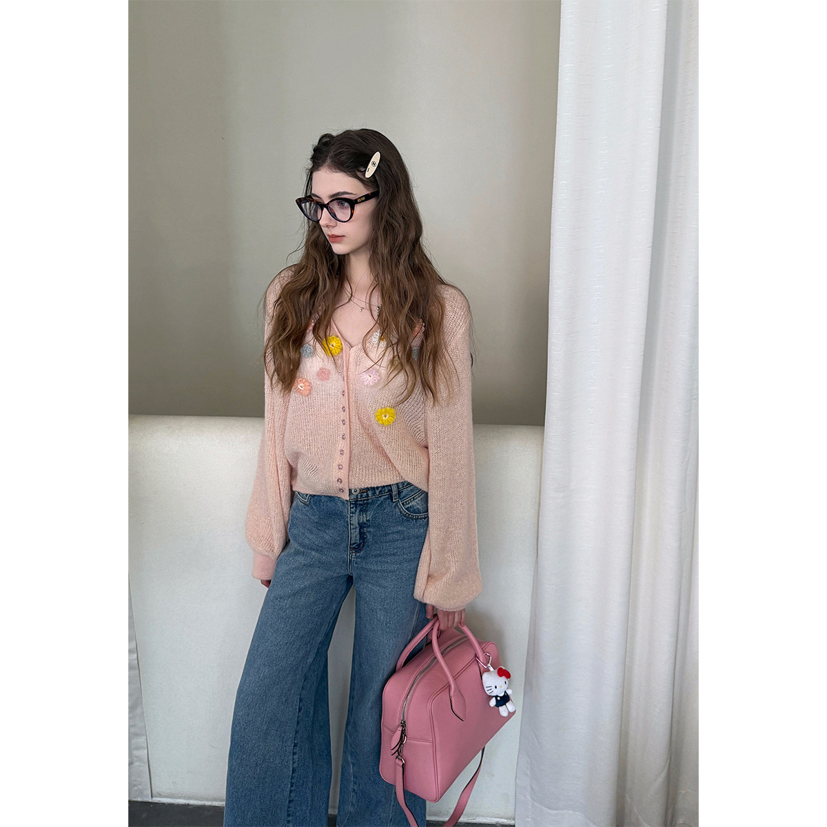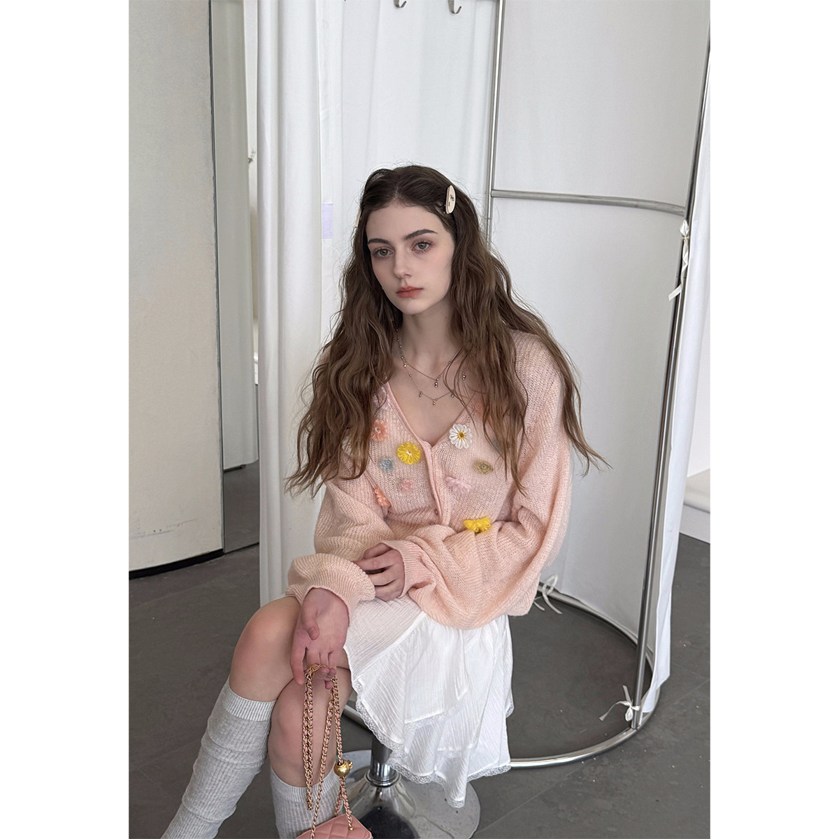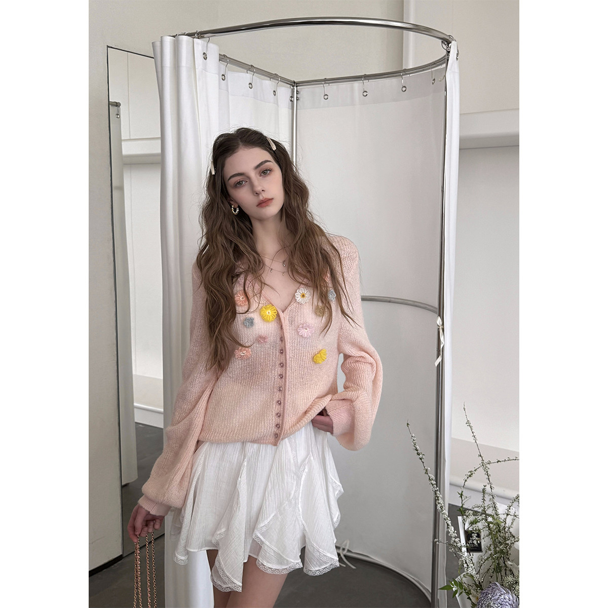 上衣 柔雾镂空马海毛手工编织花朵毛衣女V领开衫 Scout 玛德琳花园