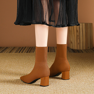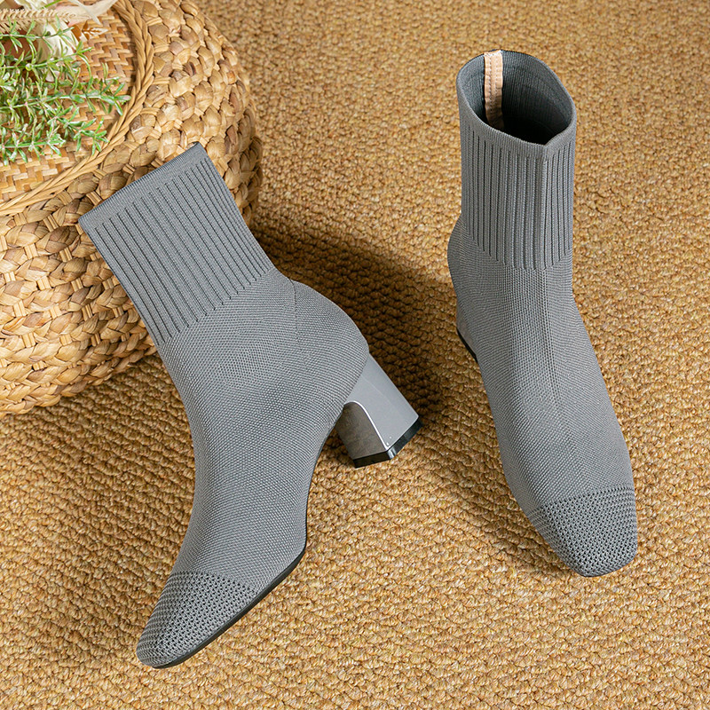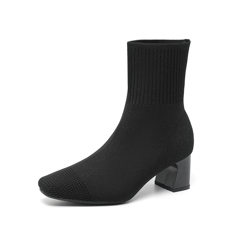 中高跟弹力布靴女士套脚女鞋 王妃鞋 短靴子四季 春秋冬款 飞编针织鞋