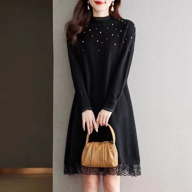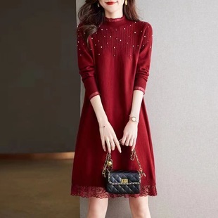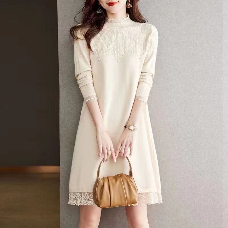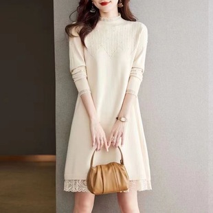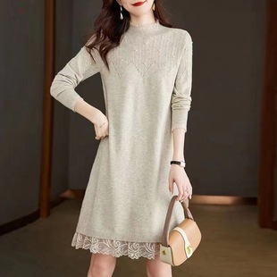 蕾丝针织连衣裙女秋冬装 配大衣打底内搭加绒加厚半高领毛衣 中长款