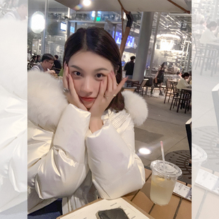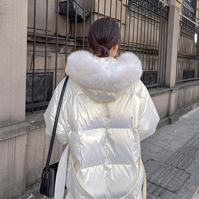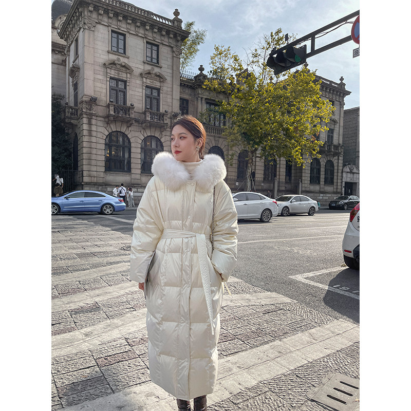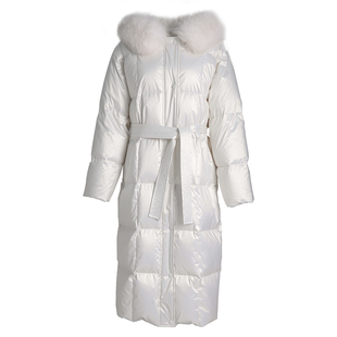 过膝狐狸大毛领亮面连帽白鹅绒外套 长款 白色羽绒服女冬季 2025新款