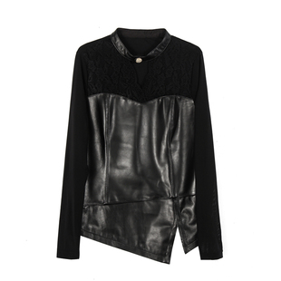 绵羊皮拼接雪纺衫 新款 立领真皮长袖 修身 蕾丝打底衫 小衫 女2025秋季
