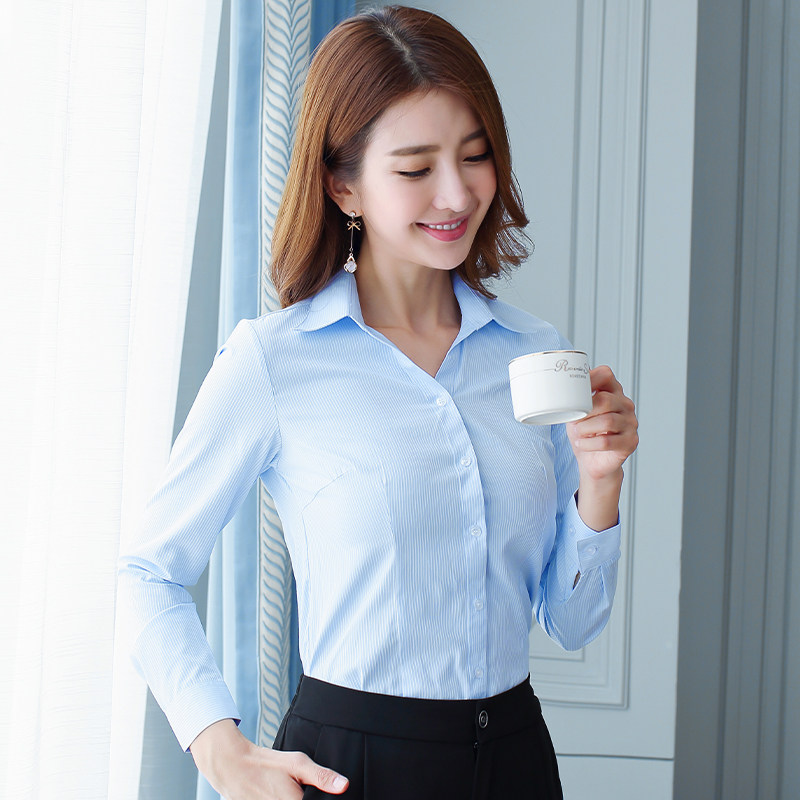 修身 女长袖 收腰V领竖条纹衬衣职业OL通勤工作服 白衬衫 2026春大码