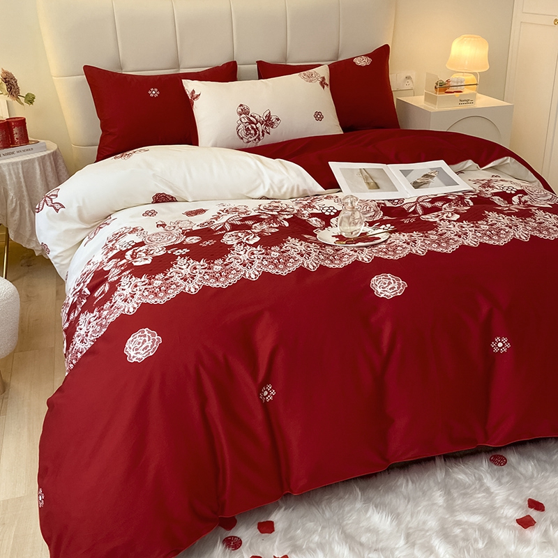中式 简约结婚四件套大红色新婚床单被套纯棉婚庆床上用品婚房陪嫁
