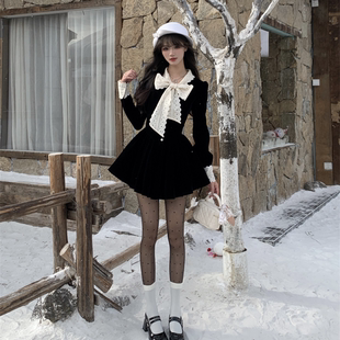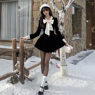 小香黑色丝绒连衣裙女蕾丝拼接公主裙 复古法式 越韩小鱼 松露黑巧
