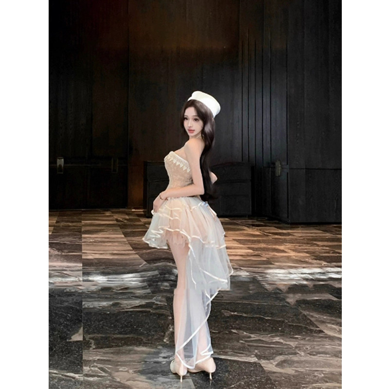 微胖名媛蕾丝花边鱼骨抹胸女千金感网纱拖尾半裙套装 XZY 欣争艳
