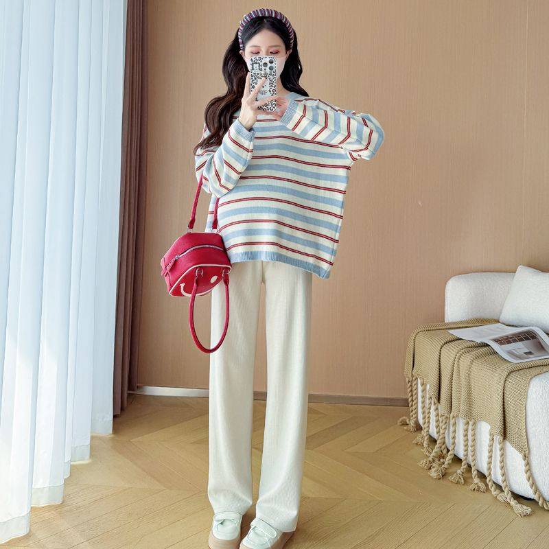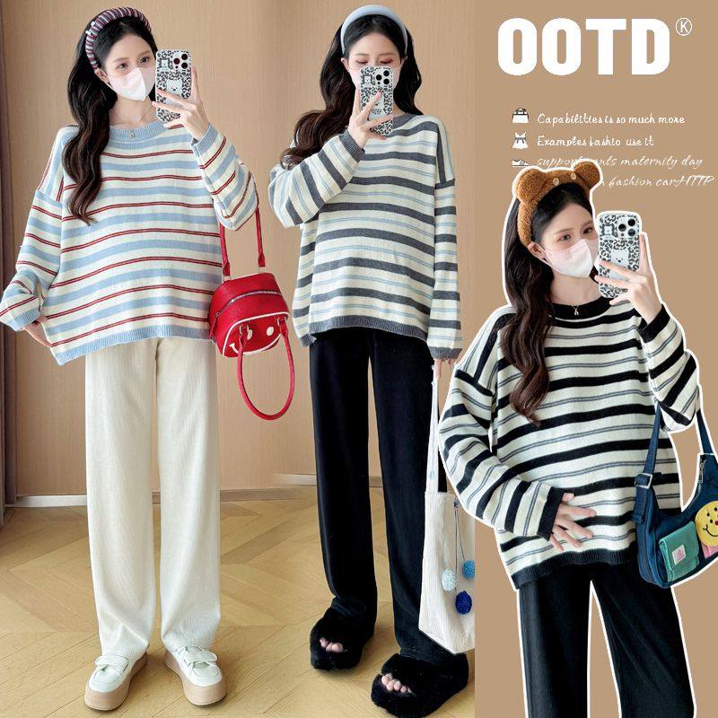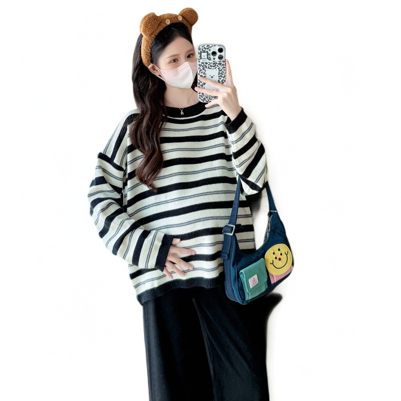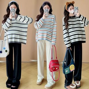 装 孕妇装 慵懒风休闲大码 秋冬新款 百搭套头上衣显瘦 圆领条纹针织衫