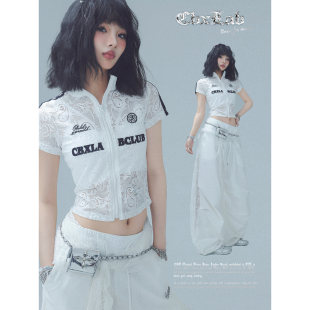辣妹性感机车短袖 CBXLAB街舞潮牌夏季 蕾丝腰果花微透爵士上衣美式