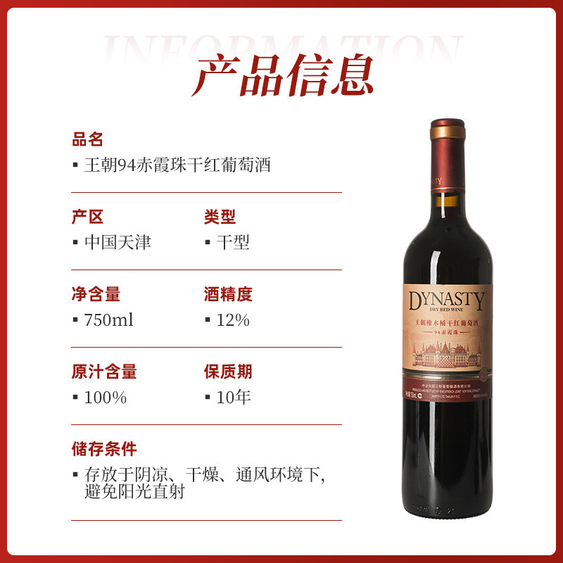 红酒 国产正品 Dynasty王朝橡木桶干红葡萄酒94赤霞珠750mL 4支瓶装