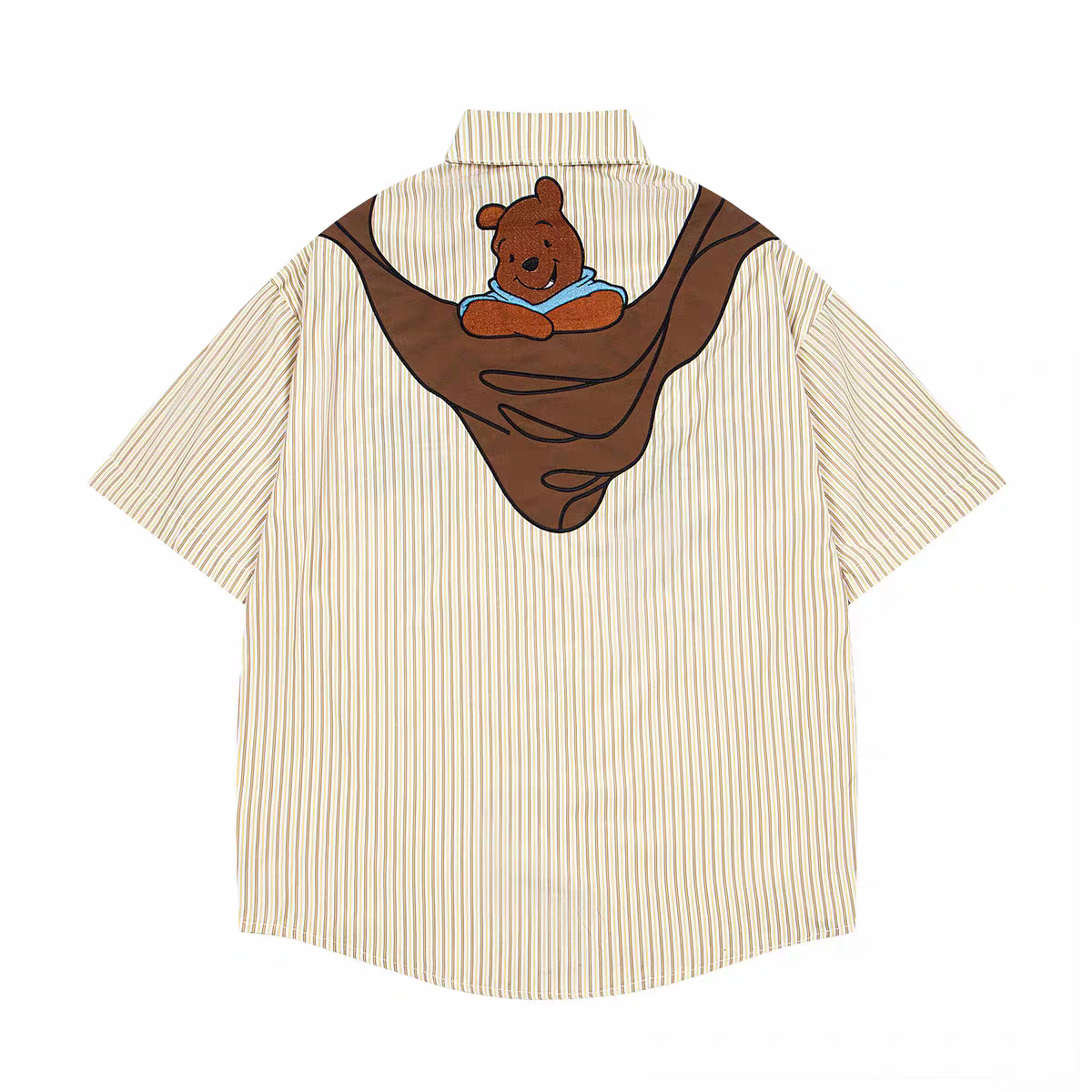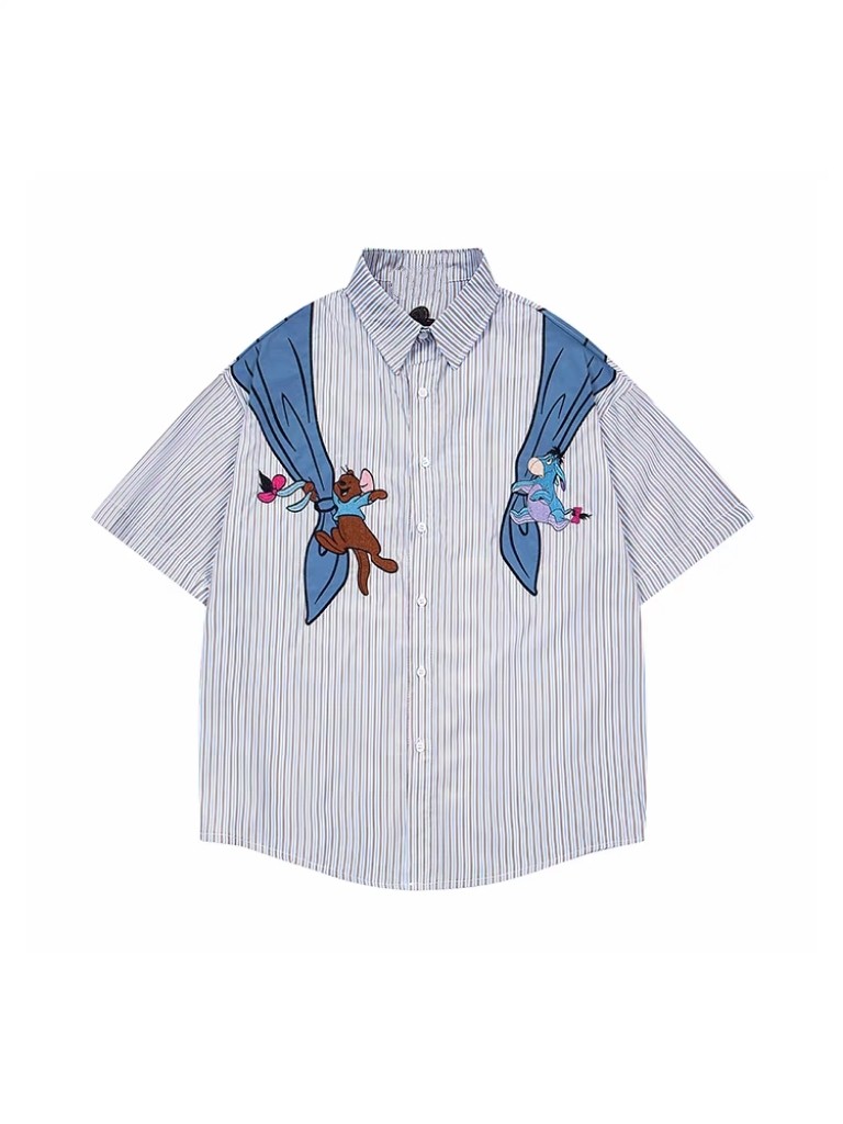 新款 美式 男女夏季 衬衫 日系港风休闲衬衣 复古卡通小熊印花条纹短袖