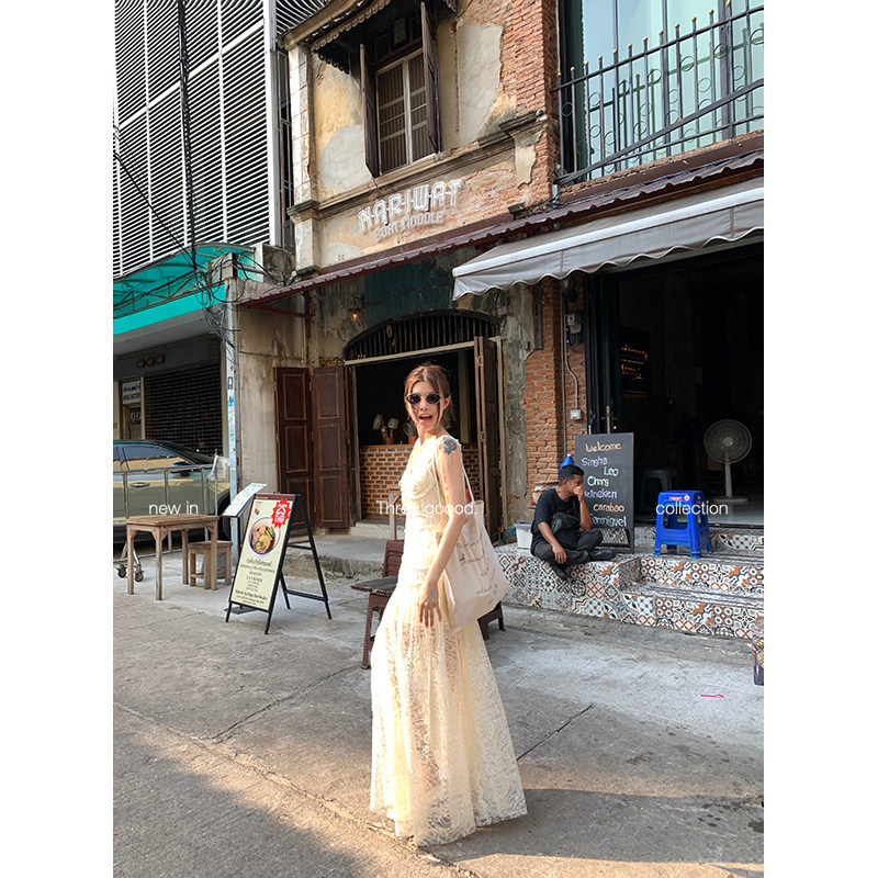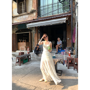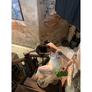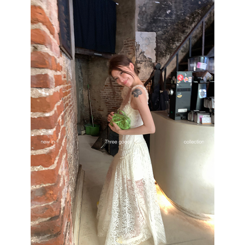 THREE GOOOD殷三吉蕾丝吊带连衣裙腰果花图案设计气质显瘦收腰长