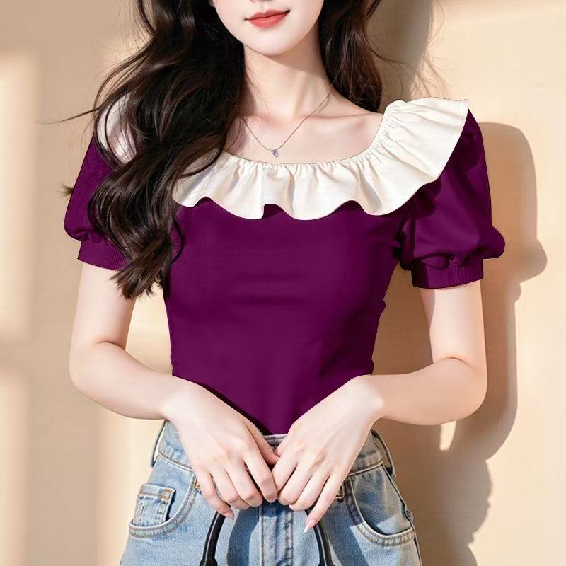 百搭设计感小衫 韩系撞色圆领短袖 上衣时尚 荷叶边泡泡袖 t恤女夏季