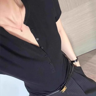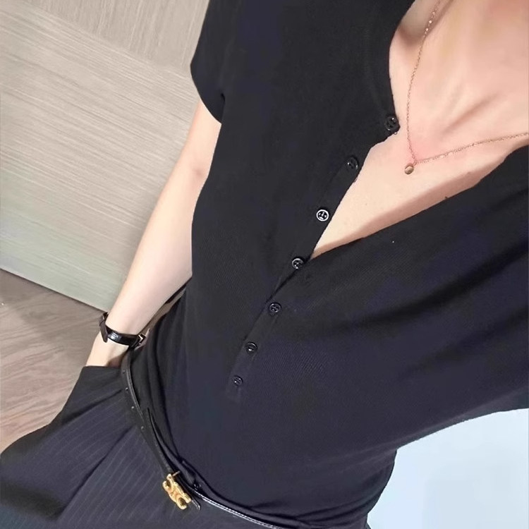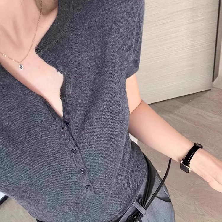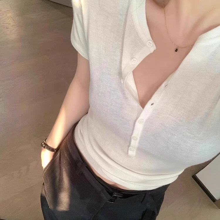 修身 v领冰丝针织衫 夏季 t恤女2025新款 设计感独特漂亮上衣 正肩短袖