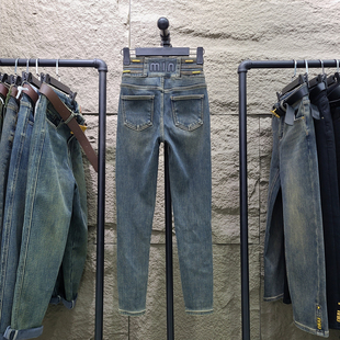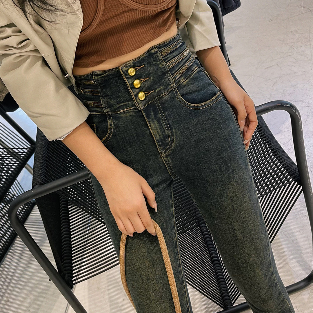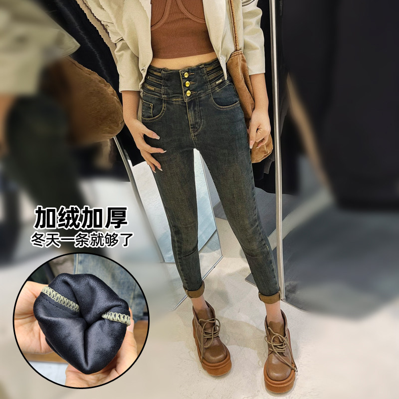 女紧身显瘦高腰弹力小脚铅笔裤 2025秋冬新款 复古蓝加绒加厚牛仔裤