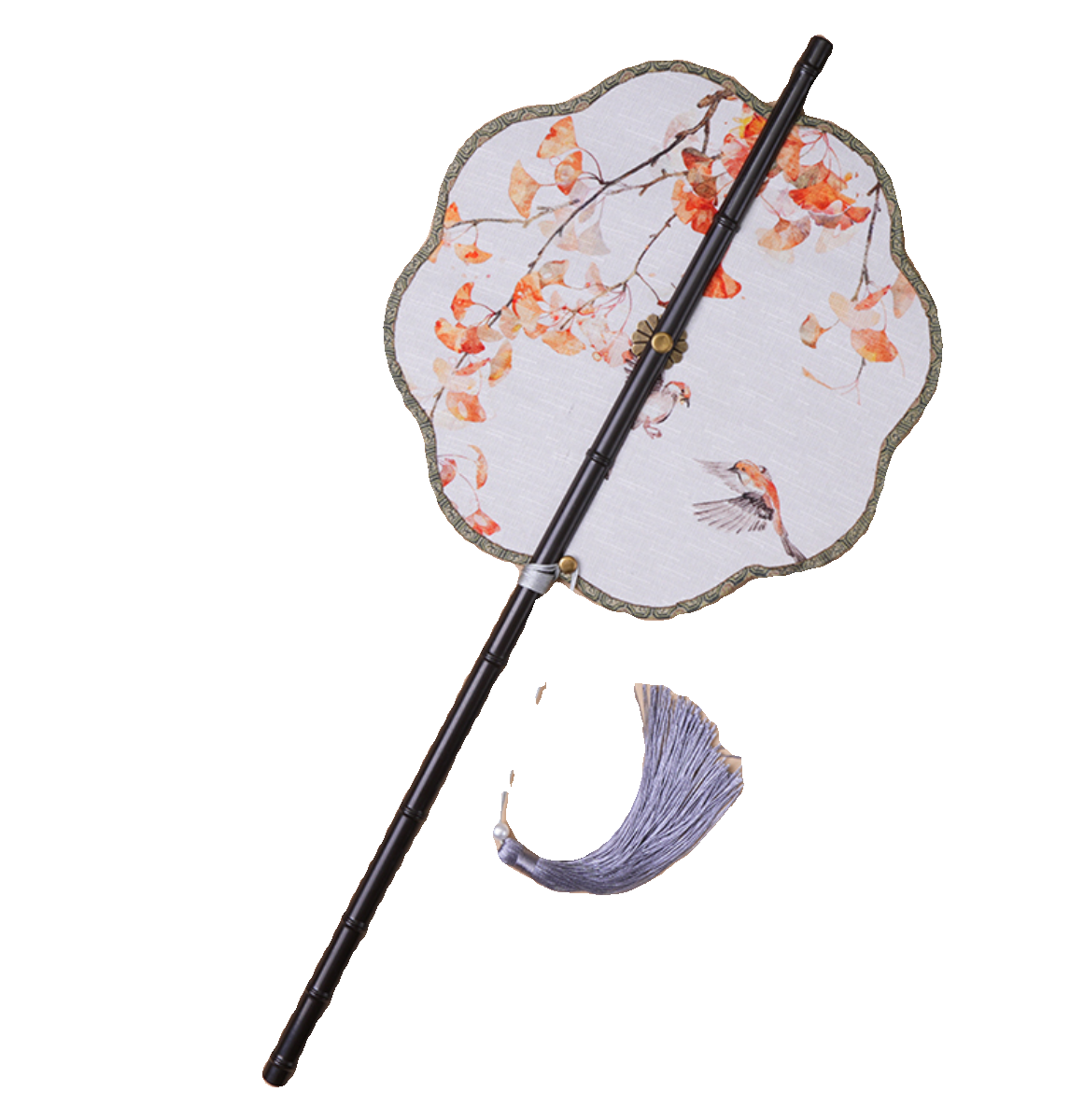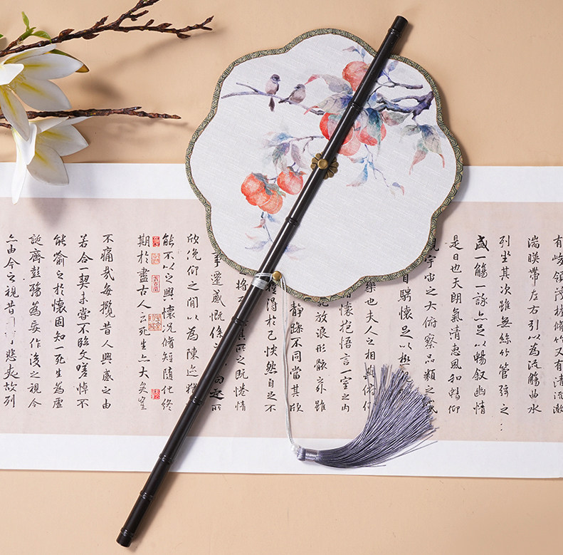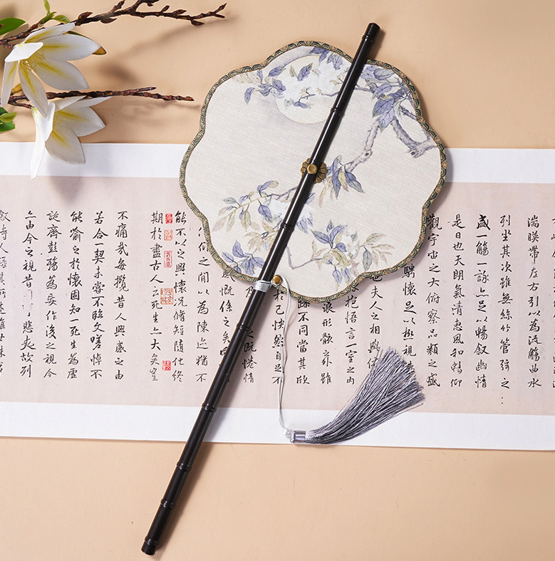 中国风古画长柄紫竹腰扇汉服搭配可折叠旋转长流苏团扇可换扇面
