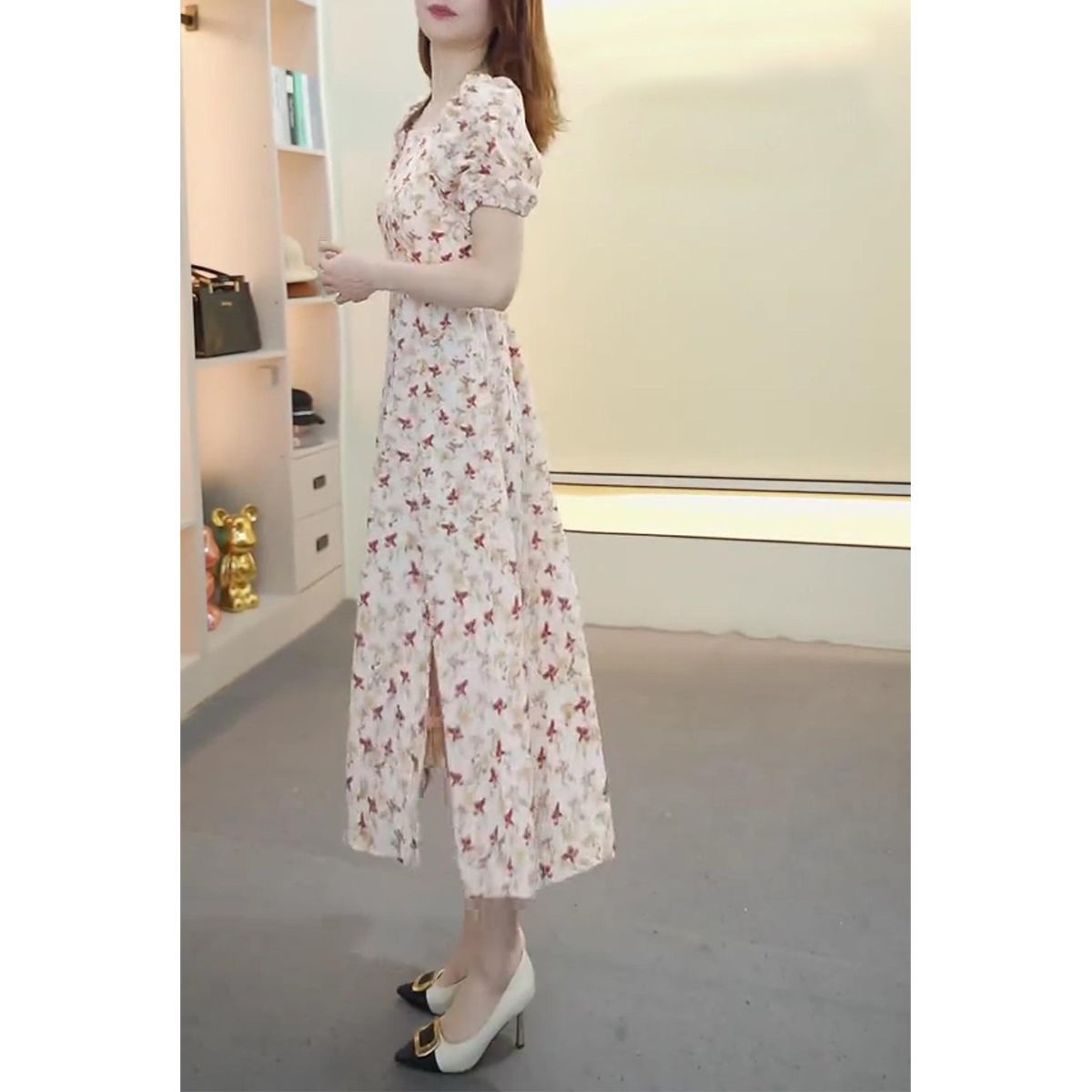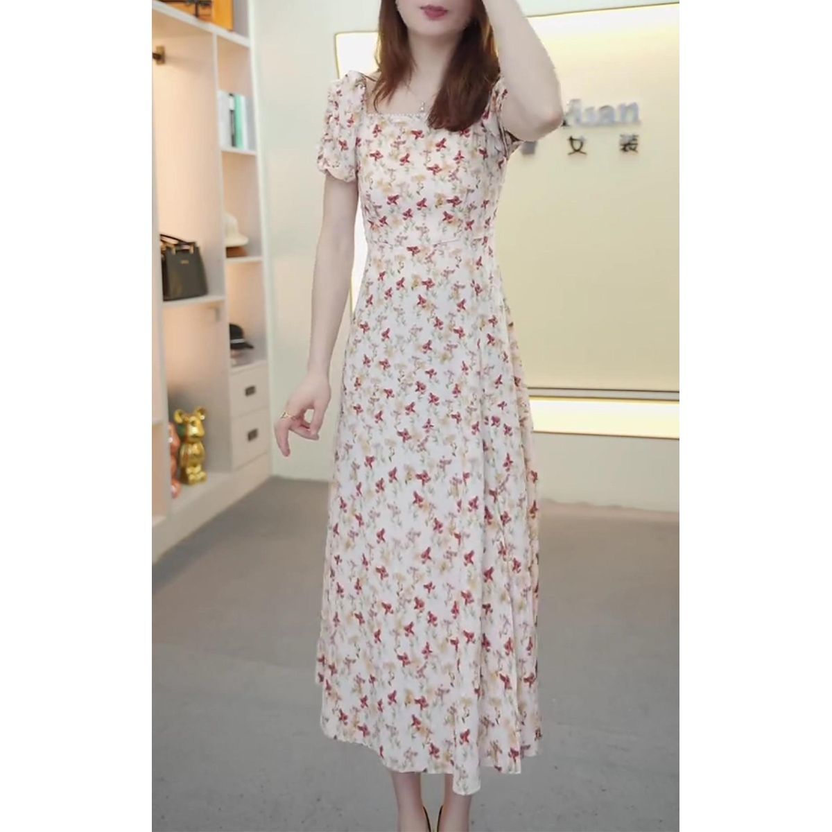 气质轻奢修身 新款 显瘦洋气温柔开叉裙 方领碎花连衣裙2025夏季 法式