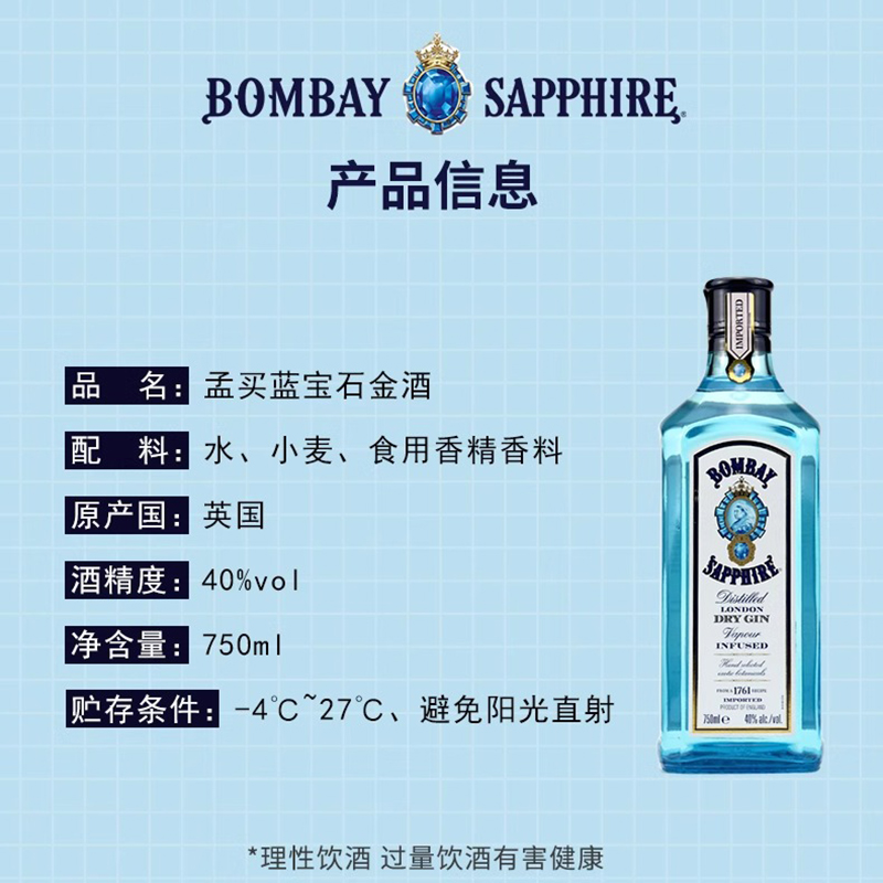 孟买蓝宝石金酒750ml金汤力Gin杜松子酒鸡尾酒基酒洋酒 自营