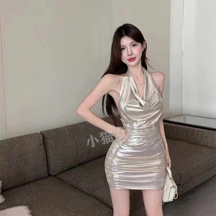 法式 气质网红性感荡领气质甜美挂脖褶皱大露背紧身显瘦包臀连衣裙