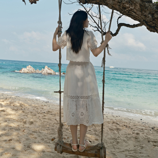 PIT复古白色镂空钩花A字半身裙女2025夏波西米亚薄款 透气中长裙