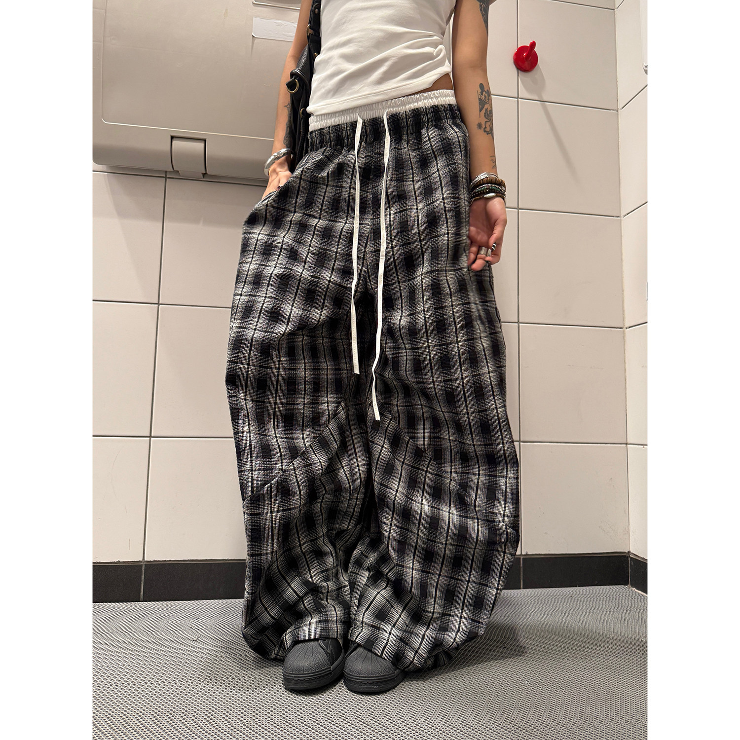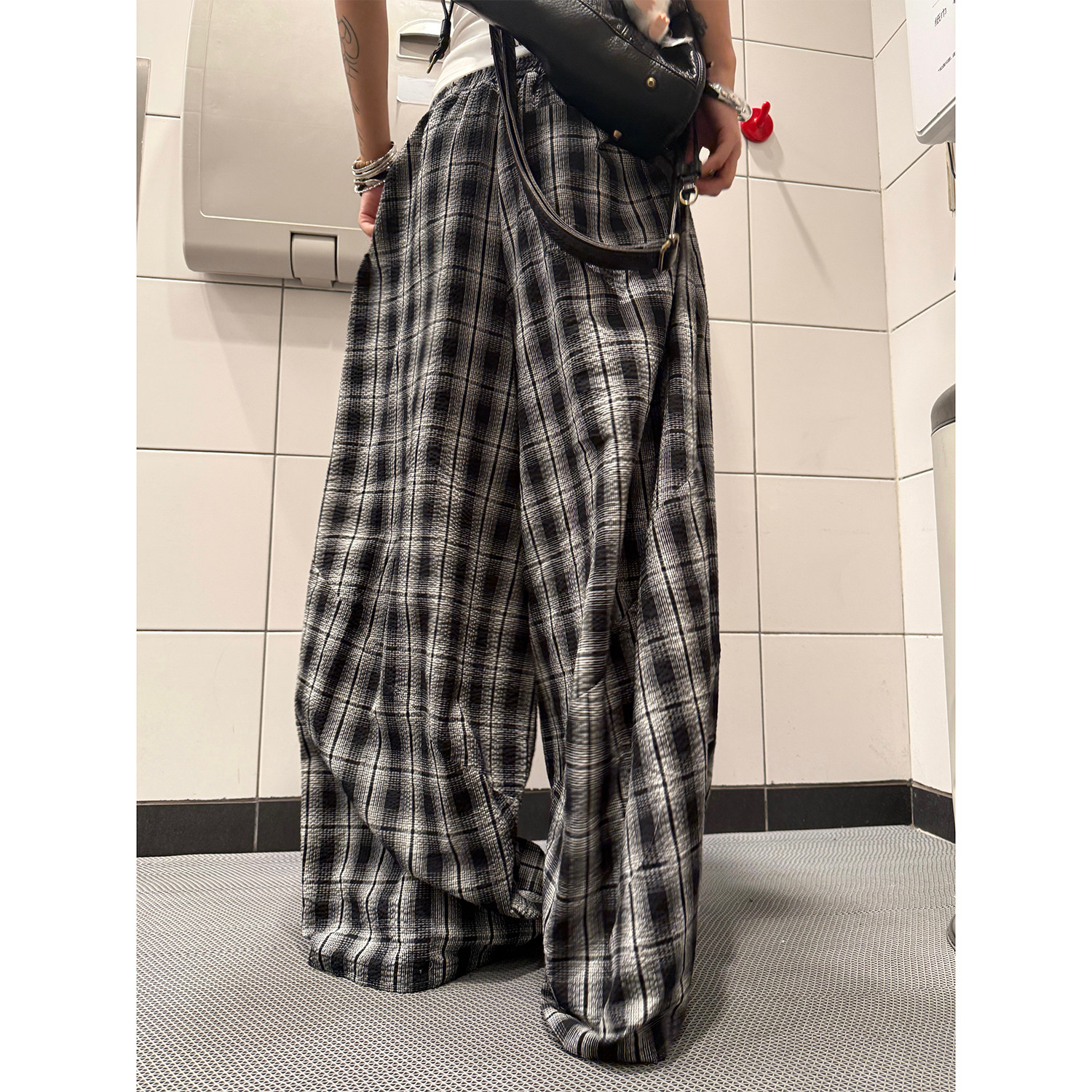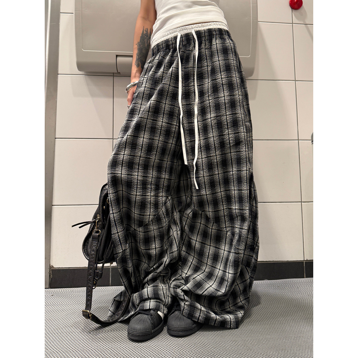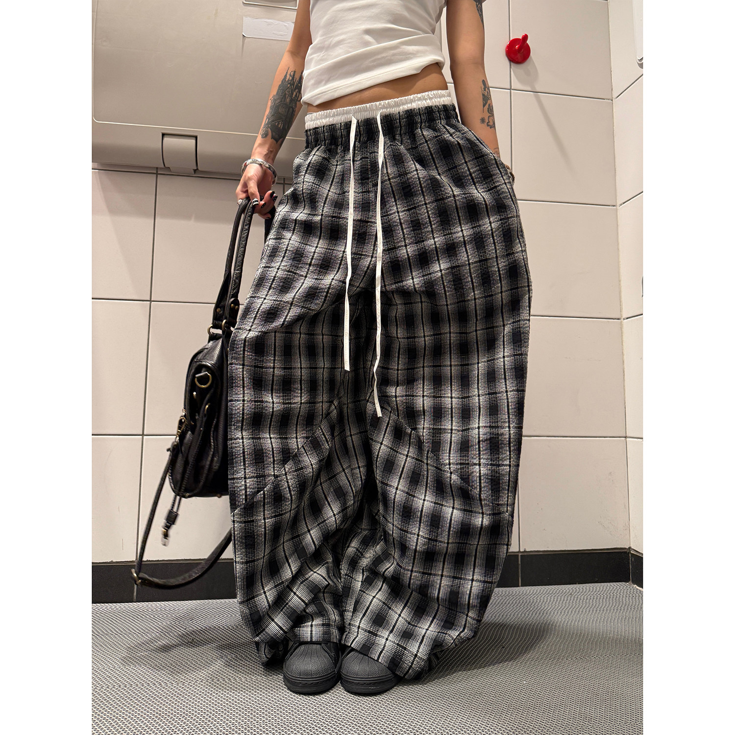 男女爵士舞双腰头拼接宽松阔腿裤 复古慵懒风百搭格子裤 美式 F383