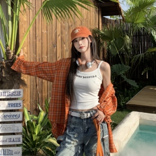 复古宽松休闲长袖 美式 衬衣外套 女春秋季 3MER哦哦三妹橙色格子衬衫