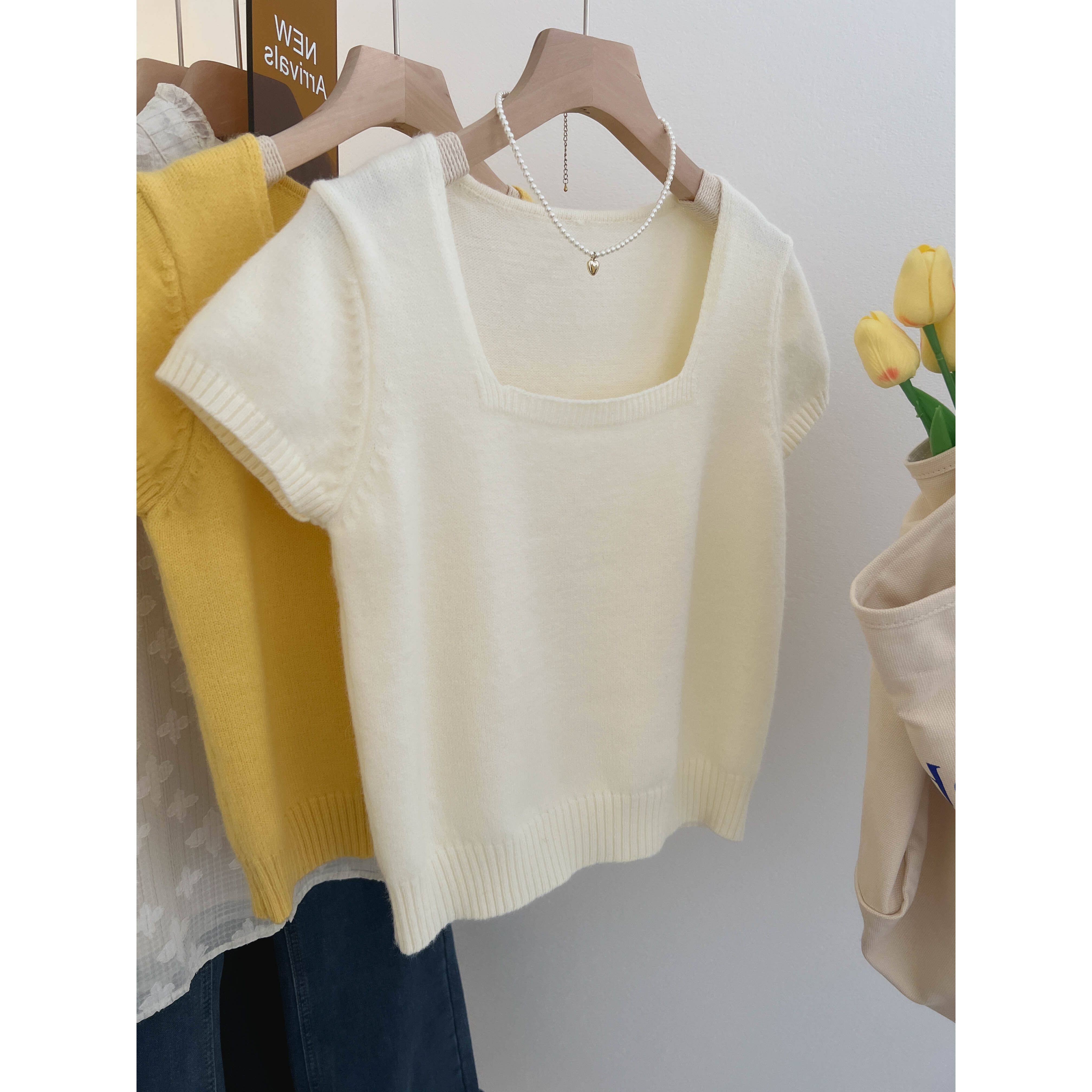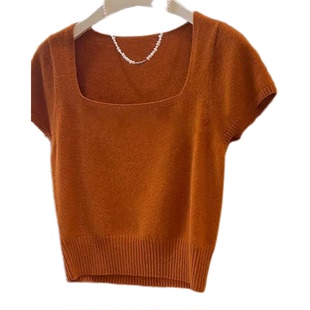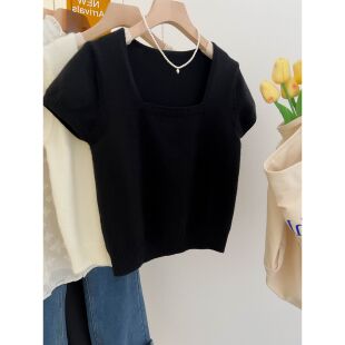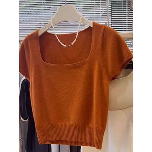 设计感修身 2025年夏季 女软糯短袖 方领高级感T恤针织衫 上衣薄 新款